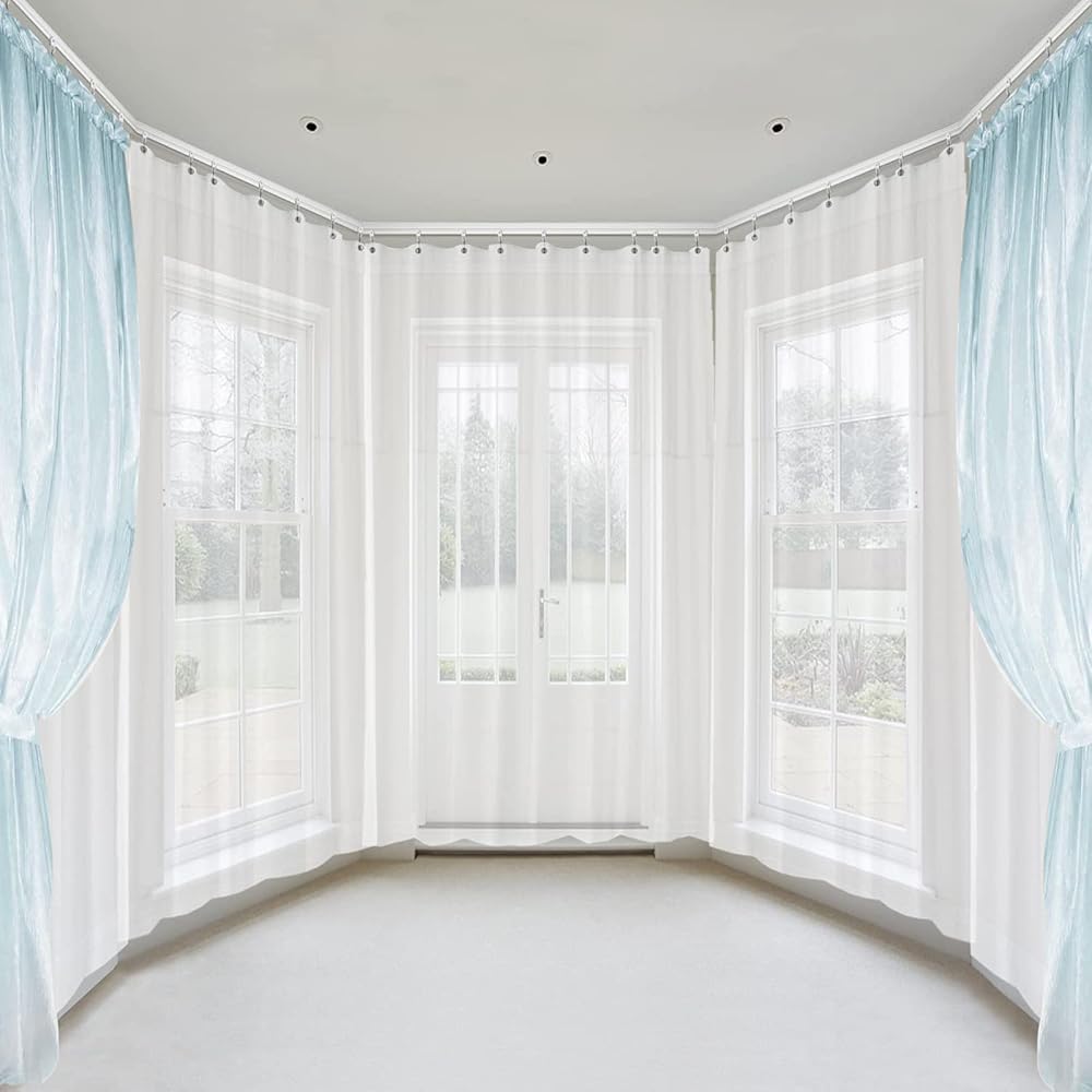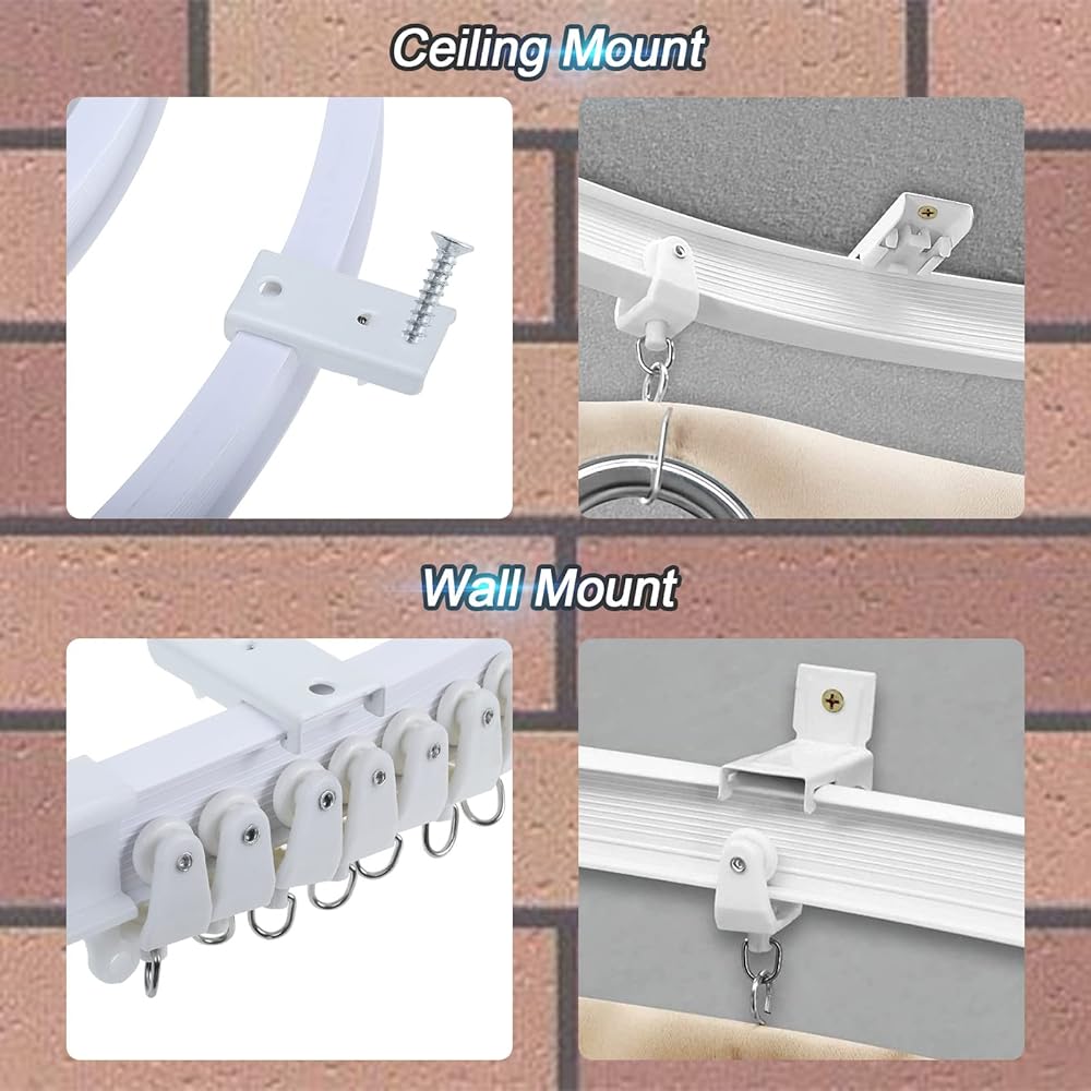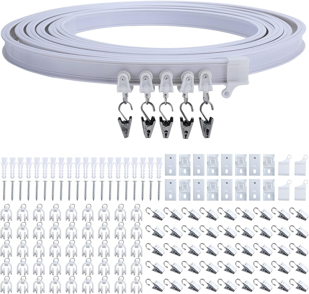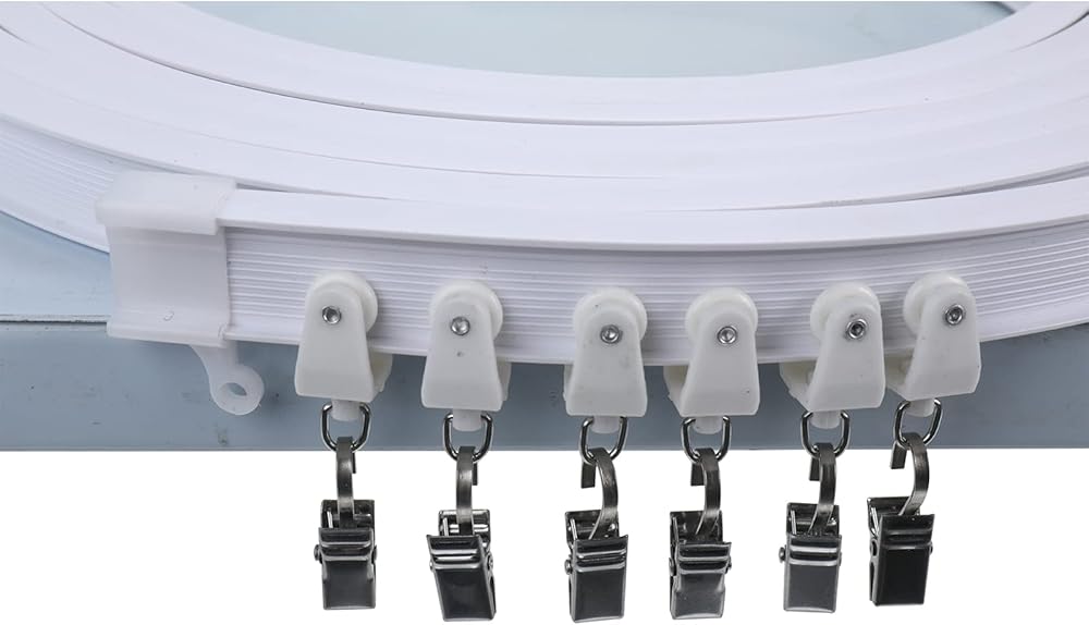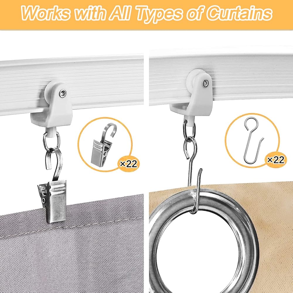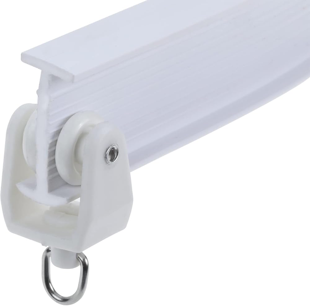 قم بتركيب البكرات والخطافات على مسار الستارة. المسار على شكل حرف I، مع جانب مسطح لأعلى وجانب منحني لأسفل.