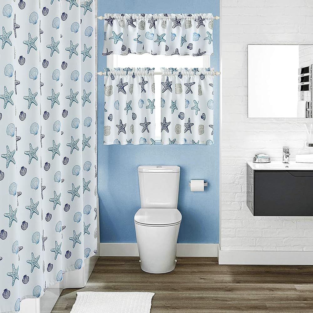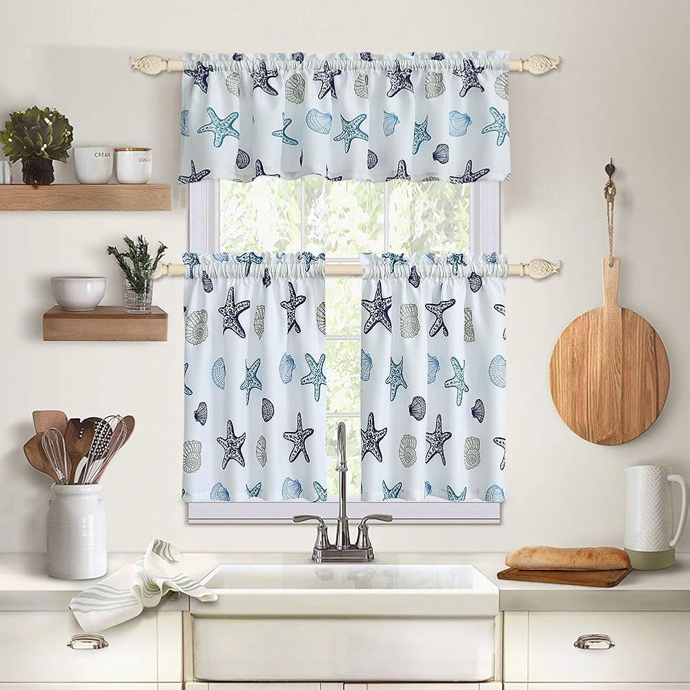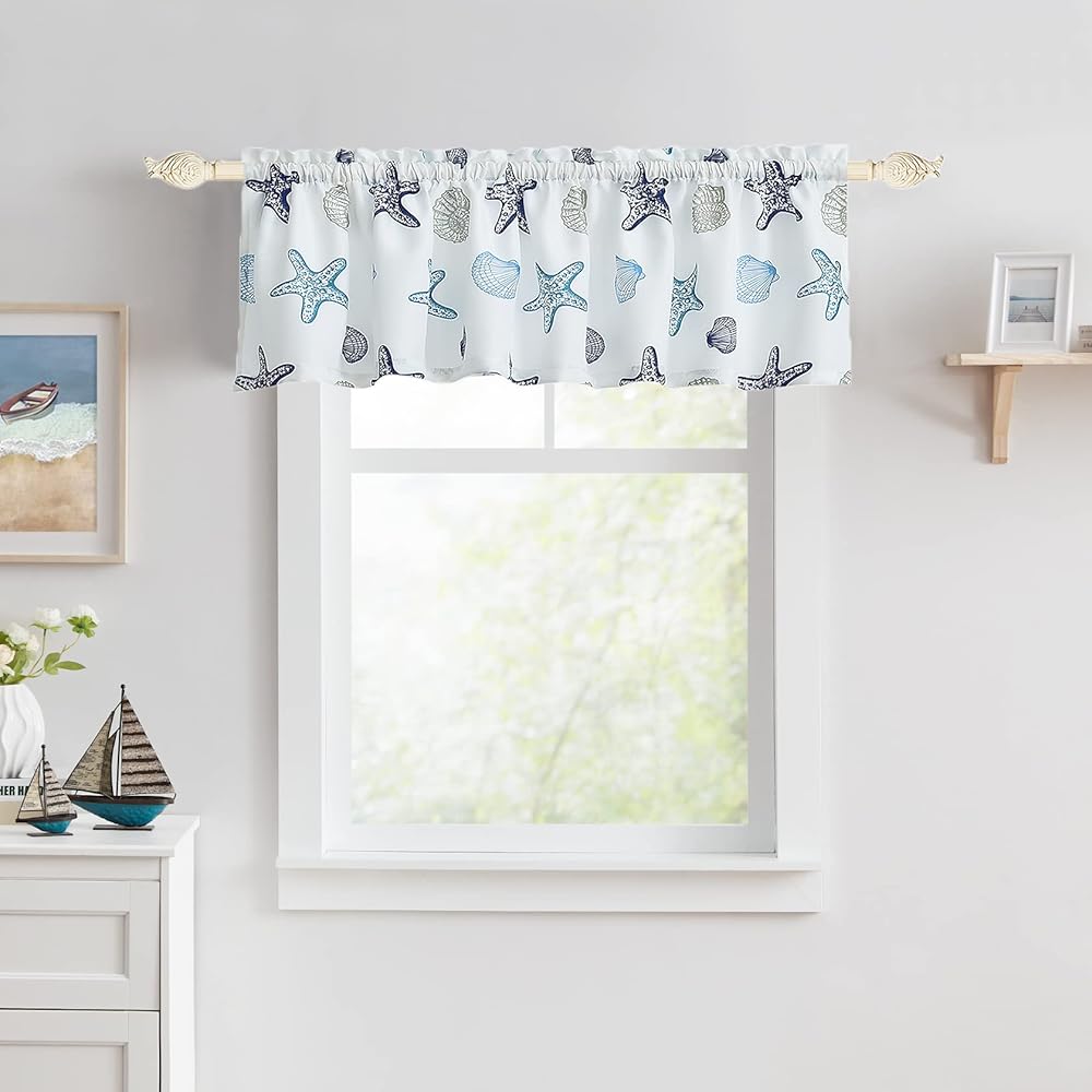 ستائر المطبخ من OREMILA للنوافذ مقاس 54 بوصة × 15 بوصة متعددة الألوان على شكل صدفة نجم البحر لغرفة المعيشة/المطبخ/الحمام، جيب قضيب، أزرق