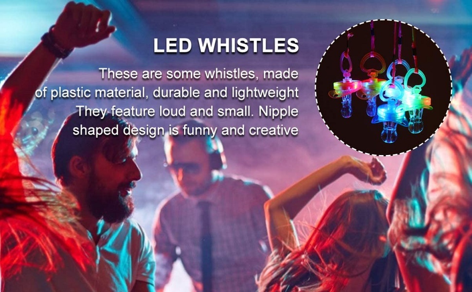 • قابلة للتطبيق --- صافرة LED من نوع الحلمة تحظى بشعبية كبيرة ويمكن أن تصدر صوتًا عاليًا، ويمكن استخدامها في مناسبات مختلفة بما في ذلك دعامات أداء مسرح الكرة التنكرية في أنشطة محاكاة ساخرة لأصدقاء رياض الأطفال والهالوين والكريسماس والفيديو الموسيقي الذي تم تصويره بنفسك ديسكو قاعة رقص بطيئة في النادي، بالإضافة إلى أدوات للتشجيع على مجموعة متنوعة من الأحداث الرياضية