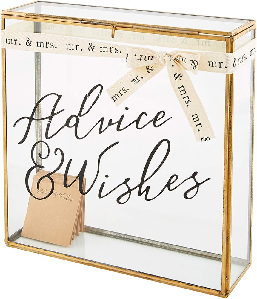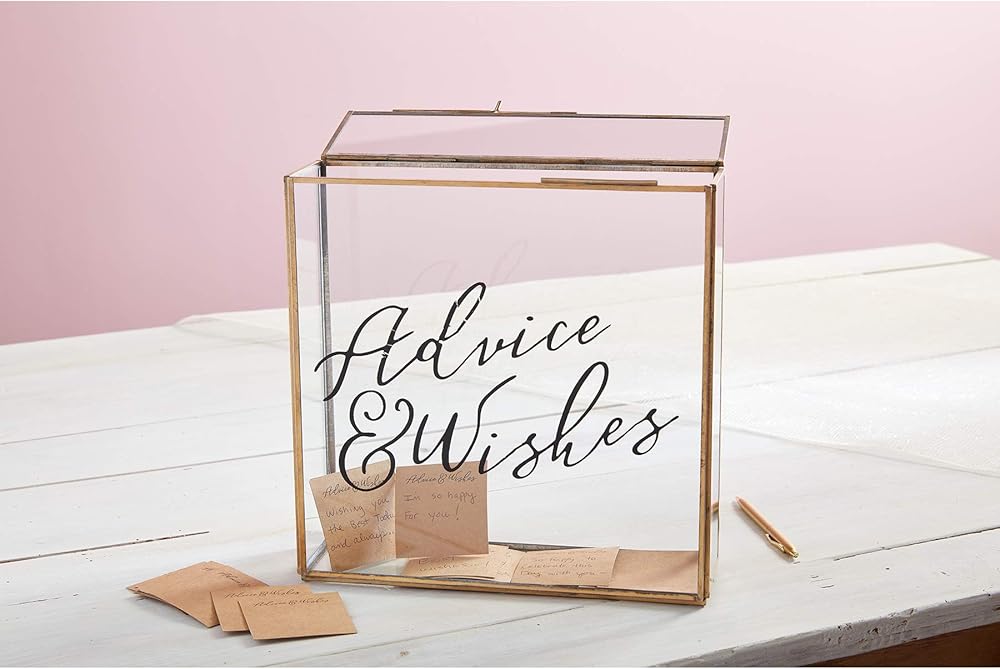 - مجموعة من قطعتين. صندوق زجاجي مزخرف بالنحاس. تصل مع 16 بطاقة كرافت قابلة للتخصيص لضيوف حفلات الزفاف أو الدش لملء "النصائح والأمنيات" للزوجين السعيدين.