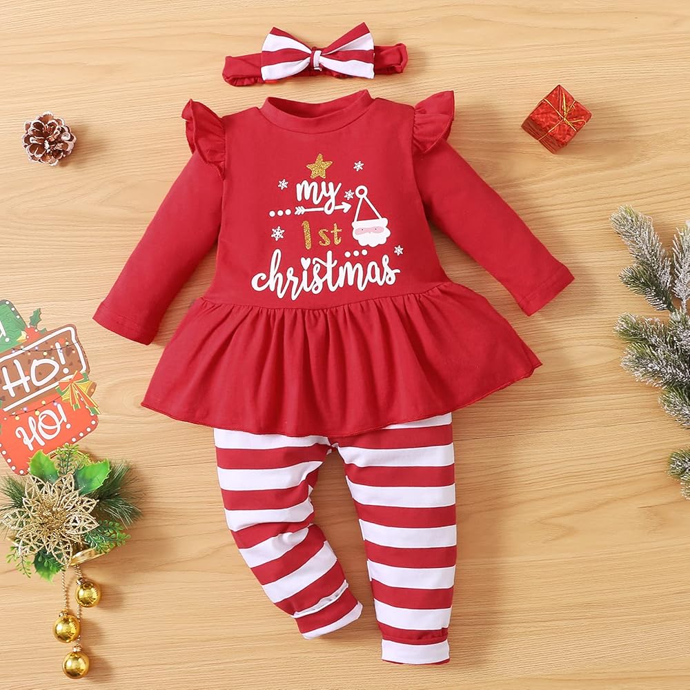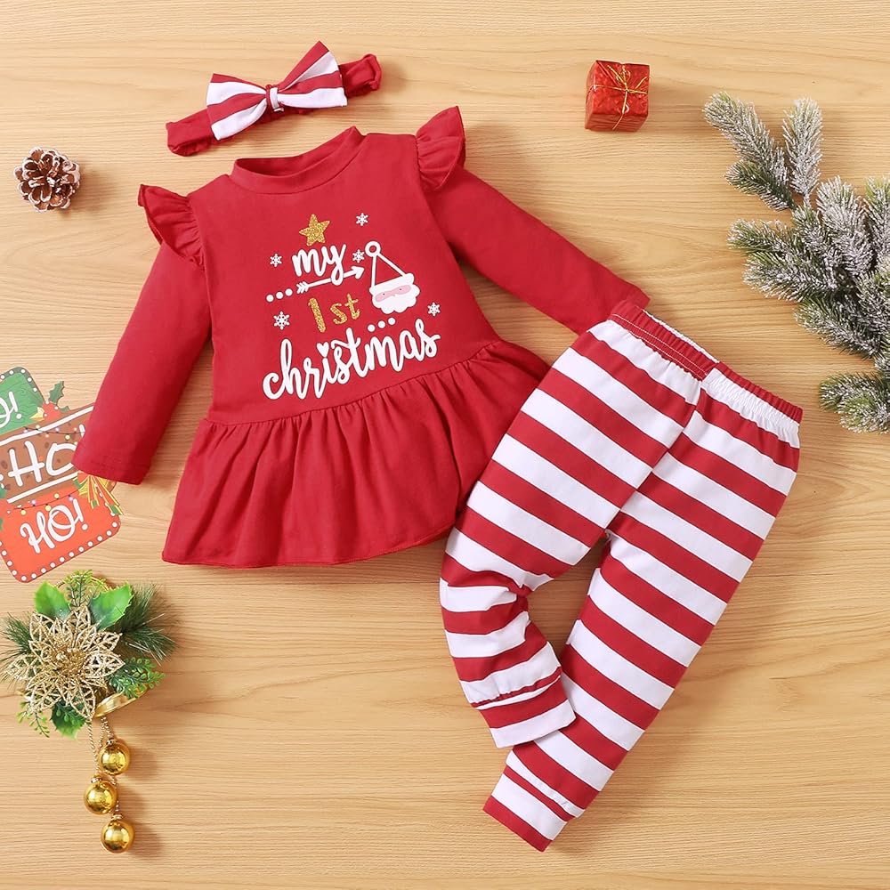 • Baby girls my first Christmas outfits. Design: Santa /Christmas tree print ,long sleeve ruffle dress shirt, red stripe/plaid pants and headband, make your girl more lovely.