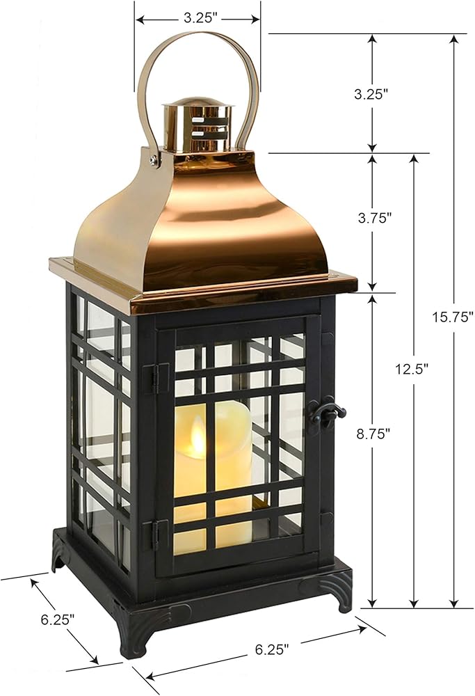 This black metal lantern with a rose gold roof and moving flame LED candle is a magnificent showpiece. The 4.5" LED candle includes a 5 hour timer with a ing amber glow that illuminates through the crystal clear tempered glass panels. The candle provides the beautiful look of a real candle without the risk of a burning flame. The removable candle allows the use of a wax pillar or LED fairy string lights. The battery operated wireless illumination is safe for indoor tabletops, seating areas, centerpieces and so much more. The loop on top of the roof allows this lantern to suspend from a wall, ceiling or shepherd's hook. Indoor Use
