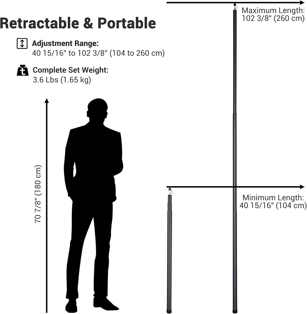 [طول قابل للتعديل]: 3 أقسام قابلة للتعديل في عمود واحد لتوفير نطاق تعديل كبير من 40 15/16 انش إلى 102 3/8 انش، يمكنك ضبطه بحرية على الطول المطلوب وفقًا للخيام والمظلات