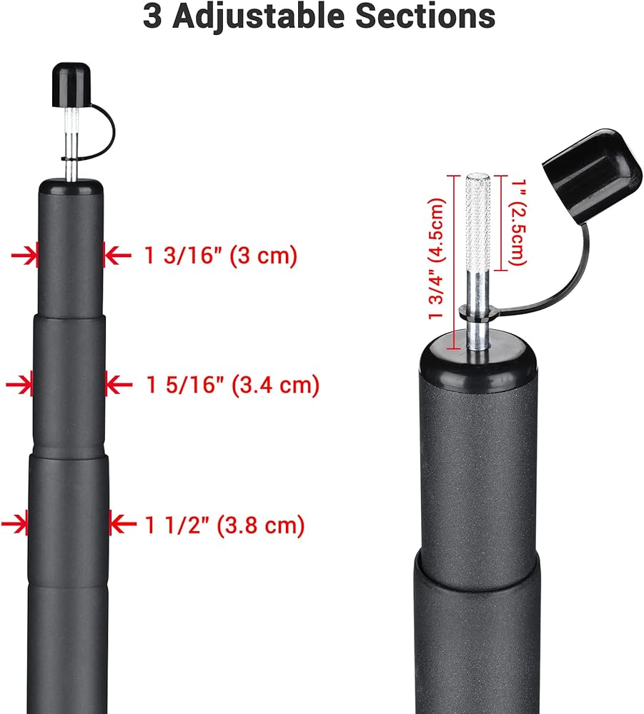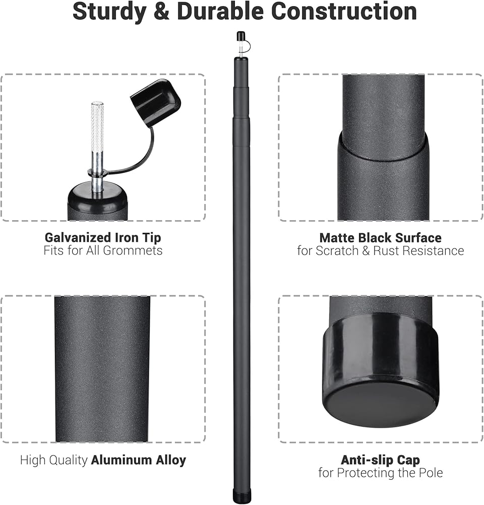 [قوي ومتين]: خليط معدني من الألومنيوم عالي القوة ومقاوم للماء بسمك جدار 1 ملم لضمان الثبات والمتانة؛ سطح أسود غير لامع لمقاومة الخدش والصدأ؛ طرف حديد مجلفن ليناسب جميع حلقات الأعمدة؛ غطاء طرف من السيليكون لمنع قماش القنب من الانزلاق وتجنب الثقوب