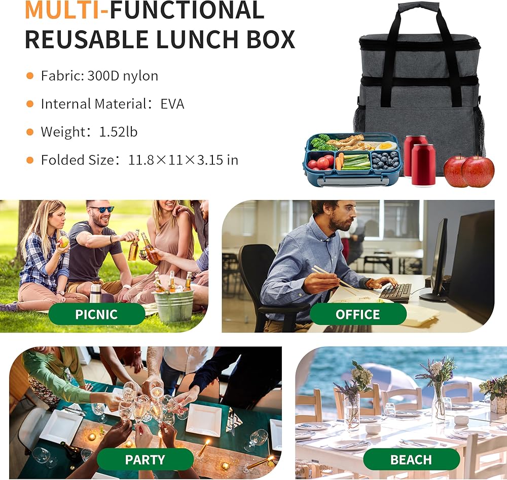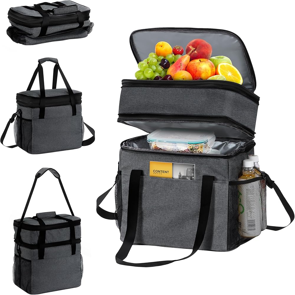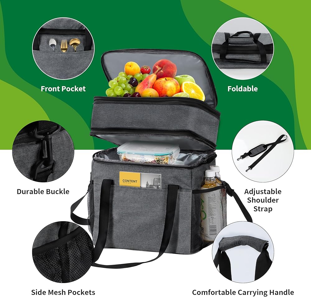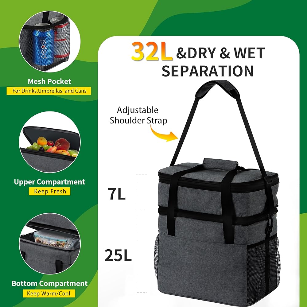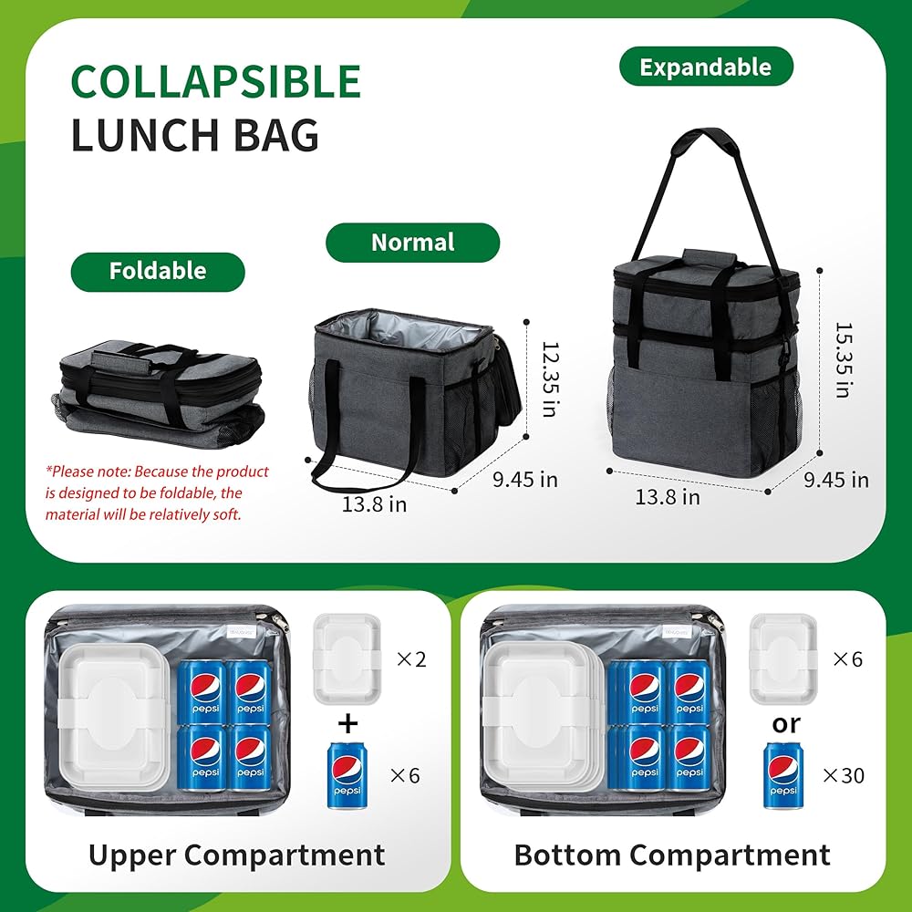 🧊 حقيبة تبريد ذات سطح مزدوج بسعة كبيرة 32 لتر - صندوق الغداء الخاص بنا عبارة عن حقيبة مزدوجة معزولة قابلة للطي وقابلة للتوسيع. يمكن أن تستوعب الحجرة السفلية بسعة 25 لتر أكثر من 30 علبة، أو على الأقل 6 صناديق بينتو. إن وضع مكعبات الثلج في الطبقة السفلية يمكن أن يحافظ على نضارة وبرودة الطعام الأساسي. الحجرة العلوية القابلة للتوسيع بسعة 7.5 لتر عبارة عن شبكة لتخزين العلب والكعك والخبز. تم تصميم الطبقتين المنفصلتين لضمان الفصل الجاف والرطب، والفصل البارد والدافئ، مما يجعل الحمل أكثر صحية.