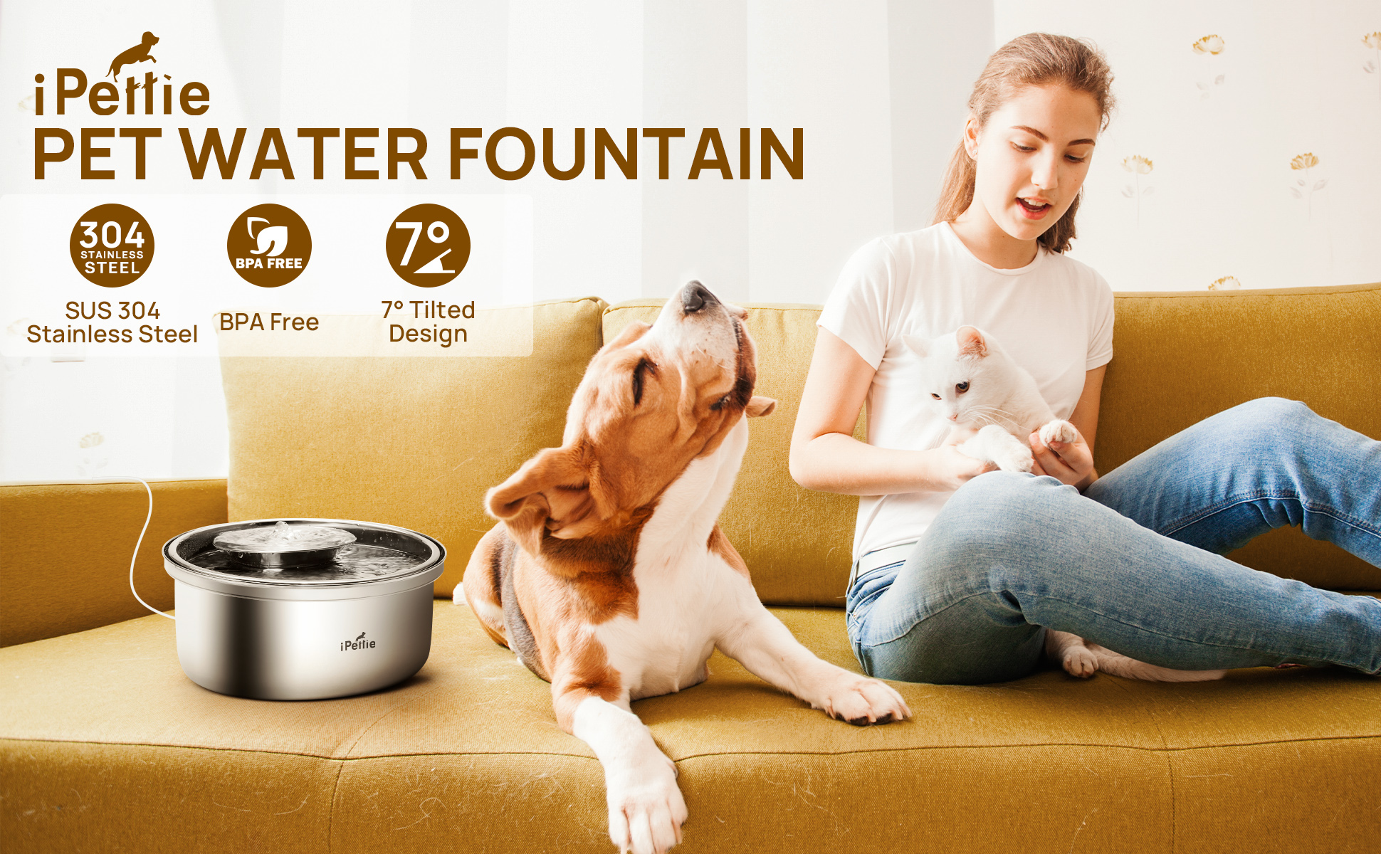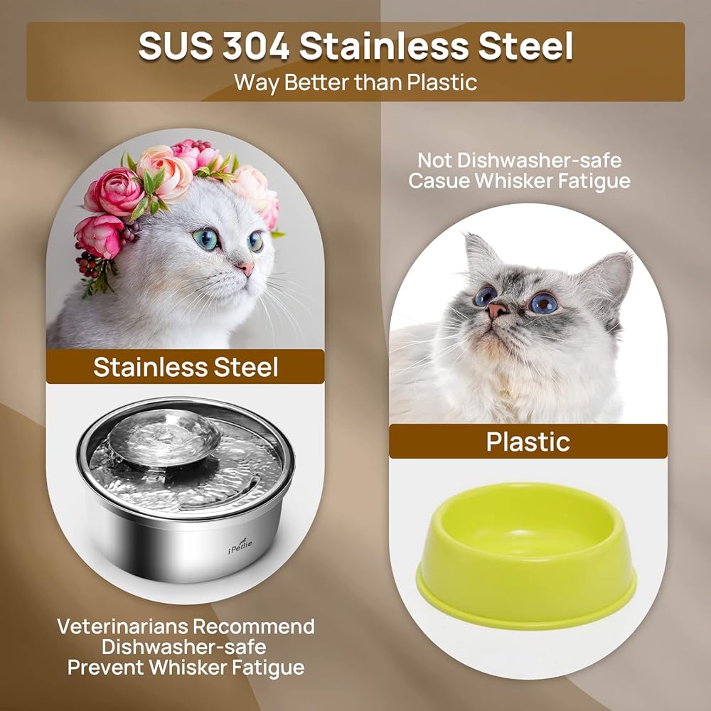 SUS 304 Stainless Steel Cat Fountain - Durable, dishwasher safe, easy to clean, better than plastic or ceramic cat water fountain, highly recommended by veterinarians.