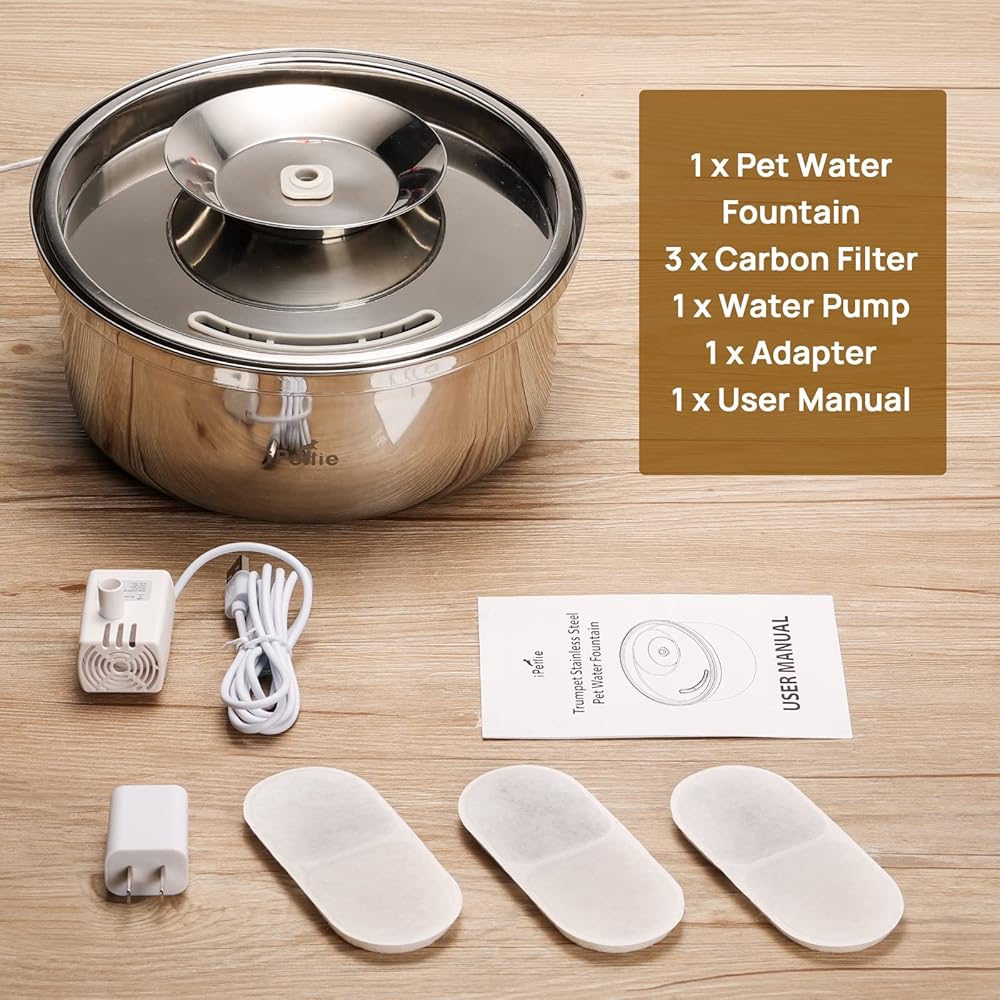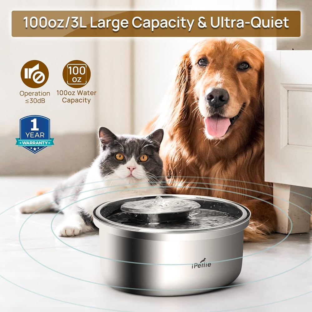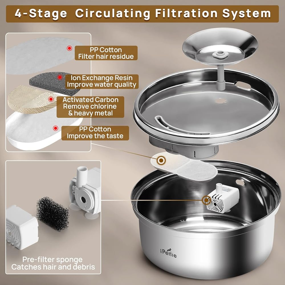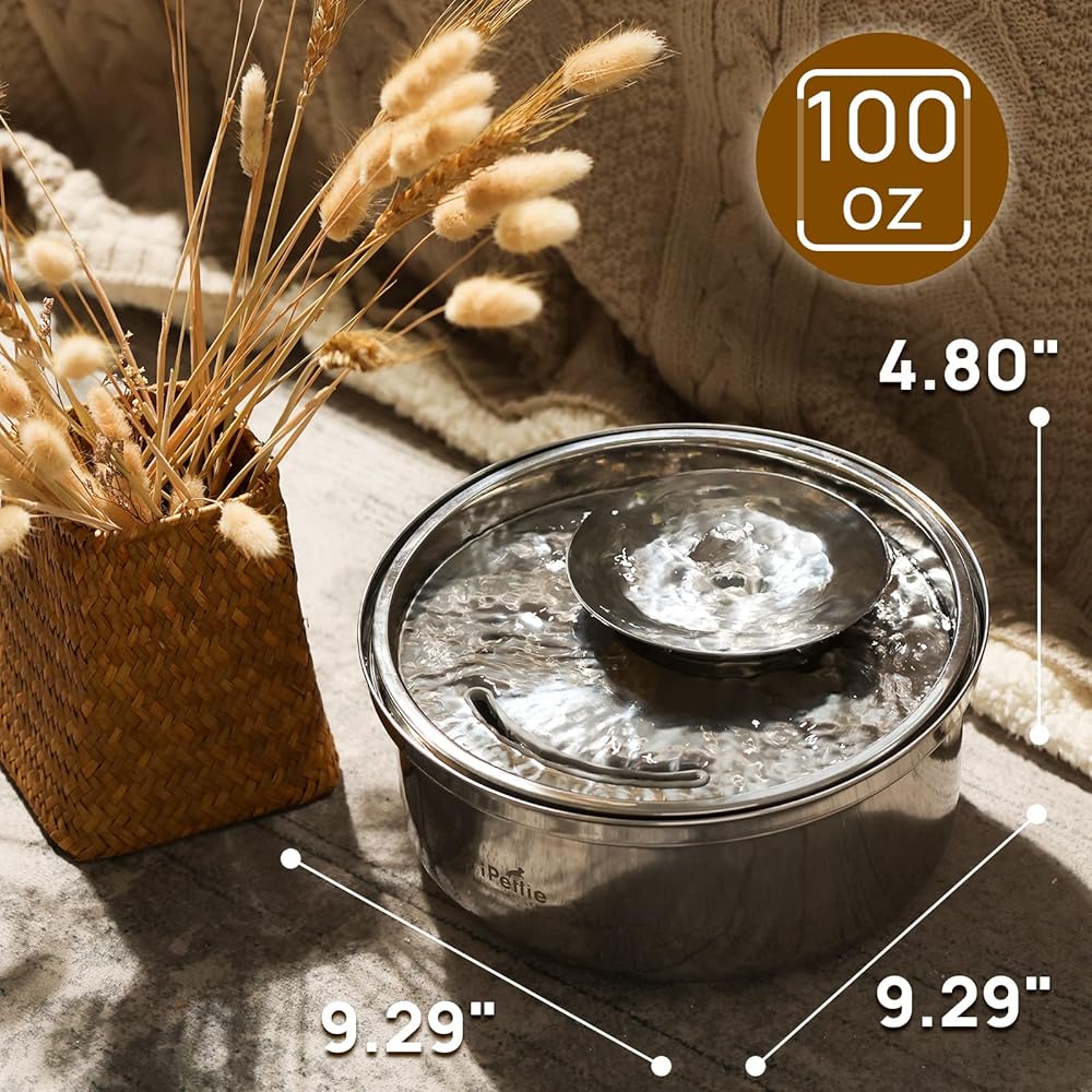 نسخة مطورة من نافورة المياه من الفولاذ المقاوم للصدأ من iPettie Trumpet Pet، سعة 100 أونصة/3 لتر، رائعة لجميع مراحل الحياة، تصميم مائل 7 درجات، ترشيح صحي على 4 مراحل، آمن للاستخدام في غسالة الأطباق فائق الهدوء، مع 3 مرشحات