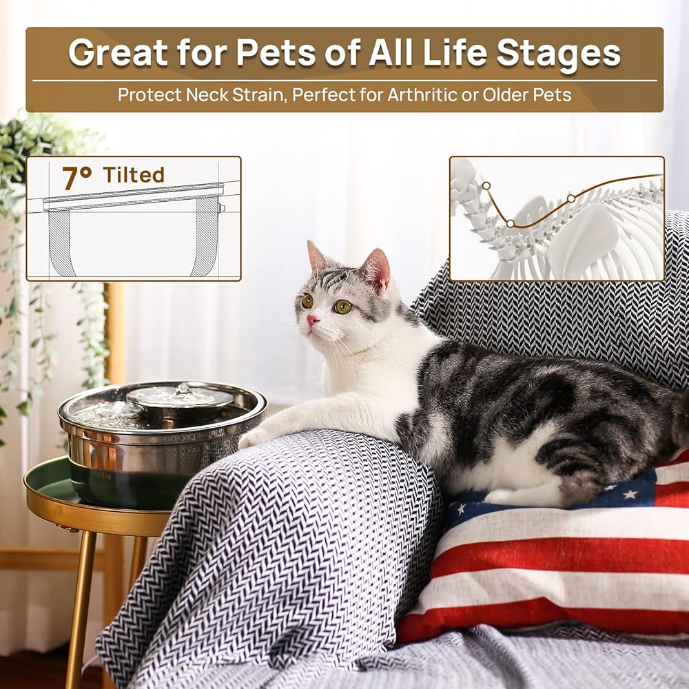 Perfect for Arthritic or Older Pets - The 7° tilted and two-tiered drinking dish design of the metal cat fountain is great for senior or arthritic pets who are unable to bend down to drink.