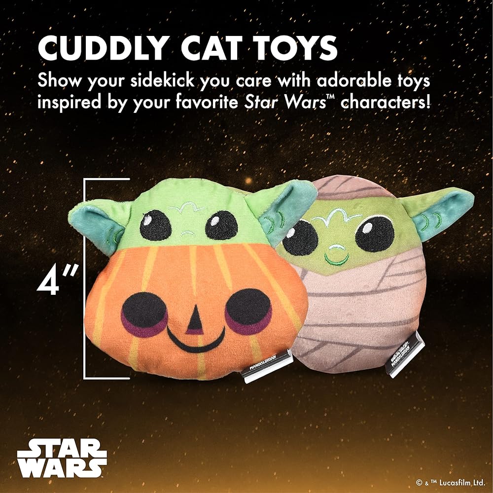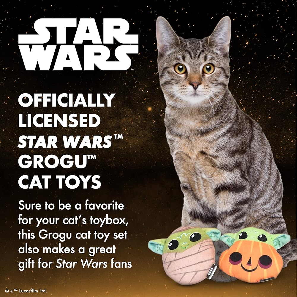 STAR WARS and THE MANDALORIAN lovers can search the galaxy, but just like the best galactic bounty hunters, you have already found the perfect STAR WARS cat toys right here, with the STAR WARS THE MANDALORIAN 4” Halloween Cat Toys featuring a GROGU Mummy & GROGU Pumpkin – each with Catnip.  This MANDALORIAN Cat Toy set features GROGU dressed as both a mummy and a jack-o-lantern, ready to go trick-or-treating with your kitty! Whether you're a fan of STAR WARS films or THE MANDALORIAN, this cute GROGU set is a great way to share your love of STAR WARS with your pet. Inspired by your favorite characters, we're celebrating all the love with these fun, playful, and engaging catnip plush toys. These are 4” tall squeaky cat toys that any STAR WARS fan would love. These plush catnip-filled GROGU toys are 4 inches tall, making it a small-sized plush that is perfect for snuggling, tossing, and light chewing. This cat toy set is made from soft fabric and contains catnip inside and a squeaker that cats can't resist! The STAR WARS cat toy set also features pet safe plush features, with no hard parts or small external pieces as choking hazards. Instead, all design details are embroidered or screen printed. This STAR WARS themed cat chew toy is intended for light chewers. Our GROGU cat toy set for Halloween is an official STAR WARS toy, so it would be perfect for film enthusiasts! As with all cat toys, please supervise your pet when they play with this toy. Sure to be a favorite for your cat's toybox, this GROGU cat toy set also makes a great gift for STAR WARS fans. Also be sure to check out our whole collection of STAR WARS character toys and accessories for pets, including YODA, CHEWBACCA, DARTH VADER, and more! Shop toys, apparel, feeding accessories, home décor, and more. Your satisfaction is our priority! Contact us at Fetch for Pets with any questions regarding this product. & Lucasfilm Ltd.