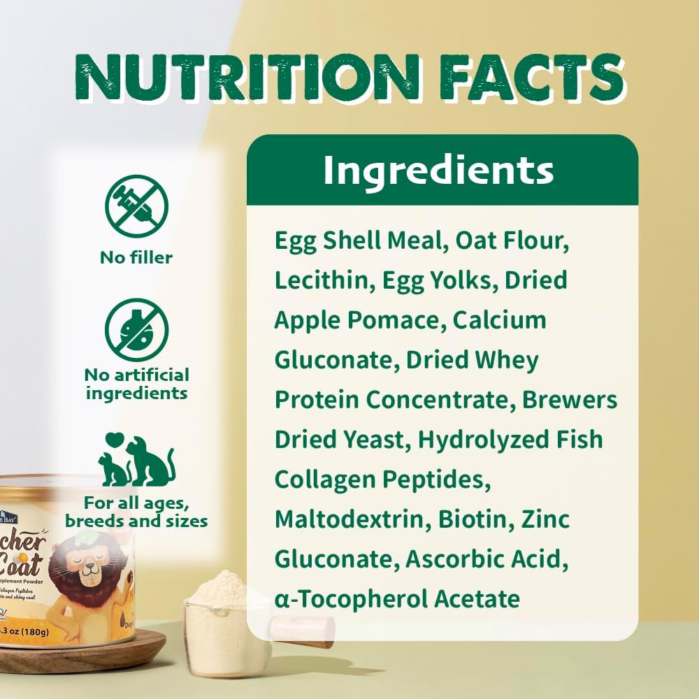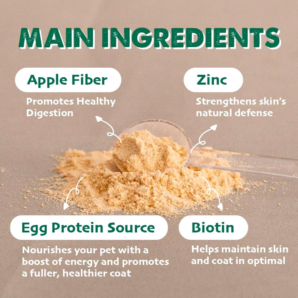 • تغذية حصرية: يتكون من وجبة قشر البيض والزنك والبيوتين والمكونات الطبيعية الأخرى للبشرة والفرو