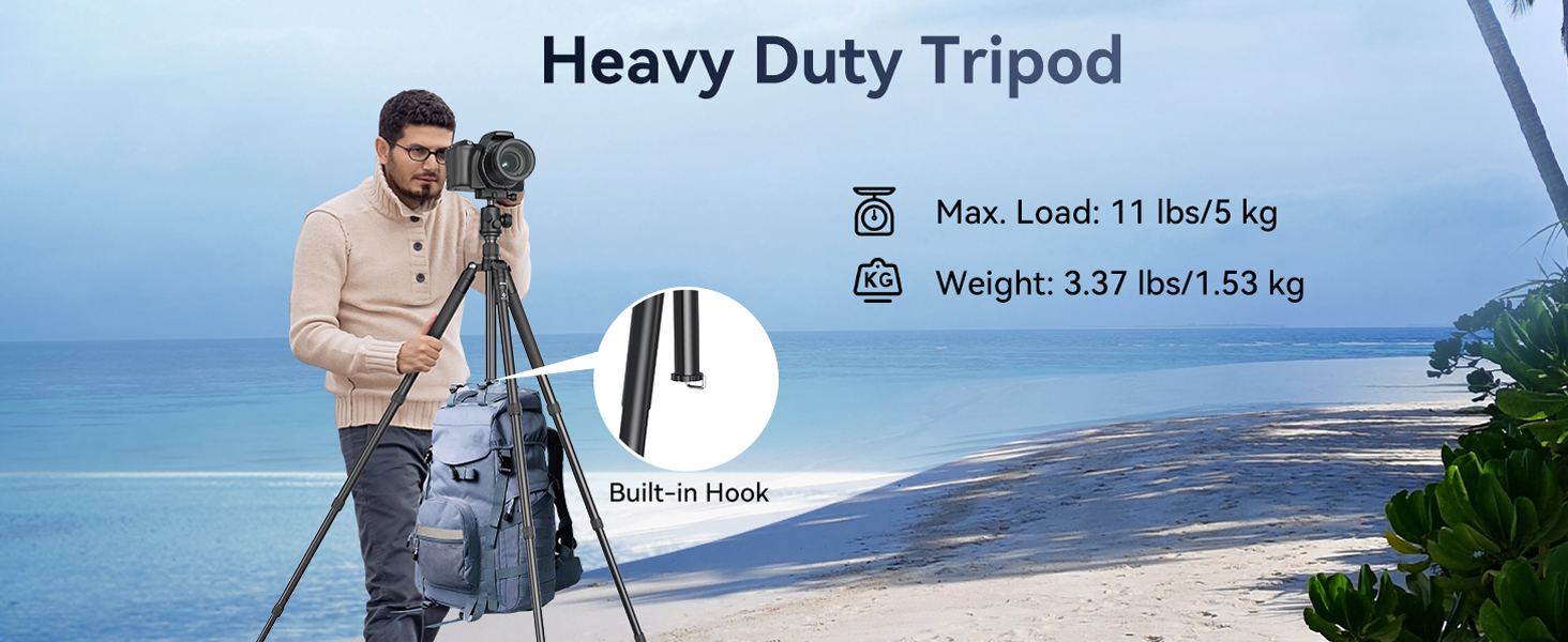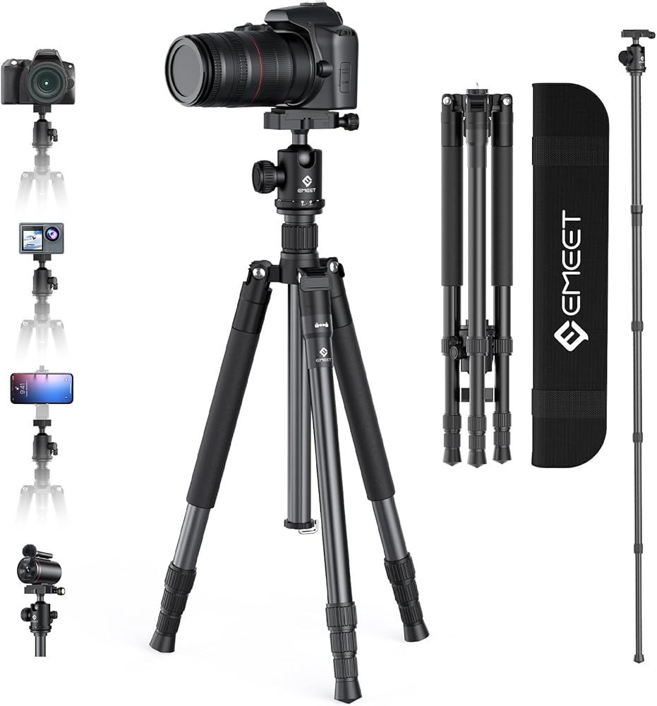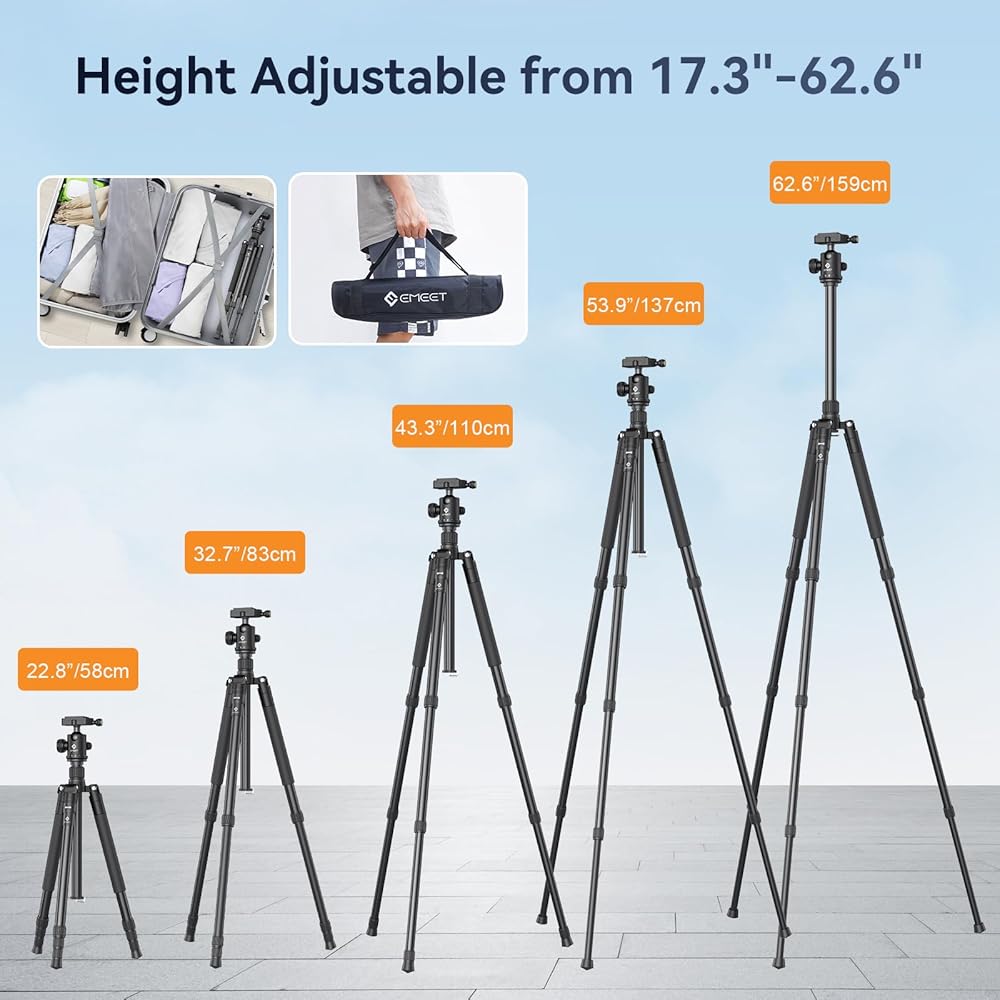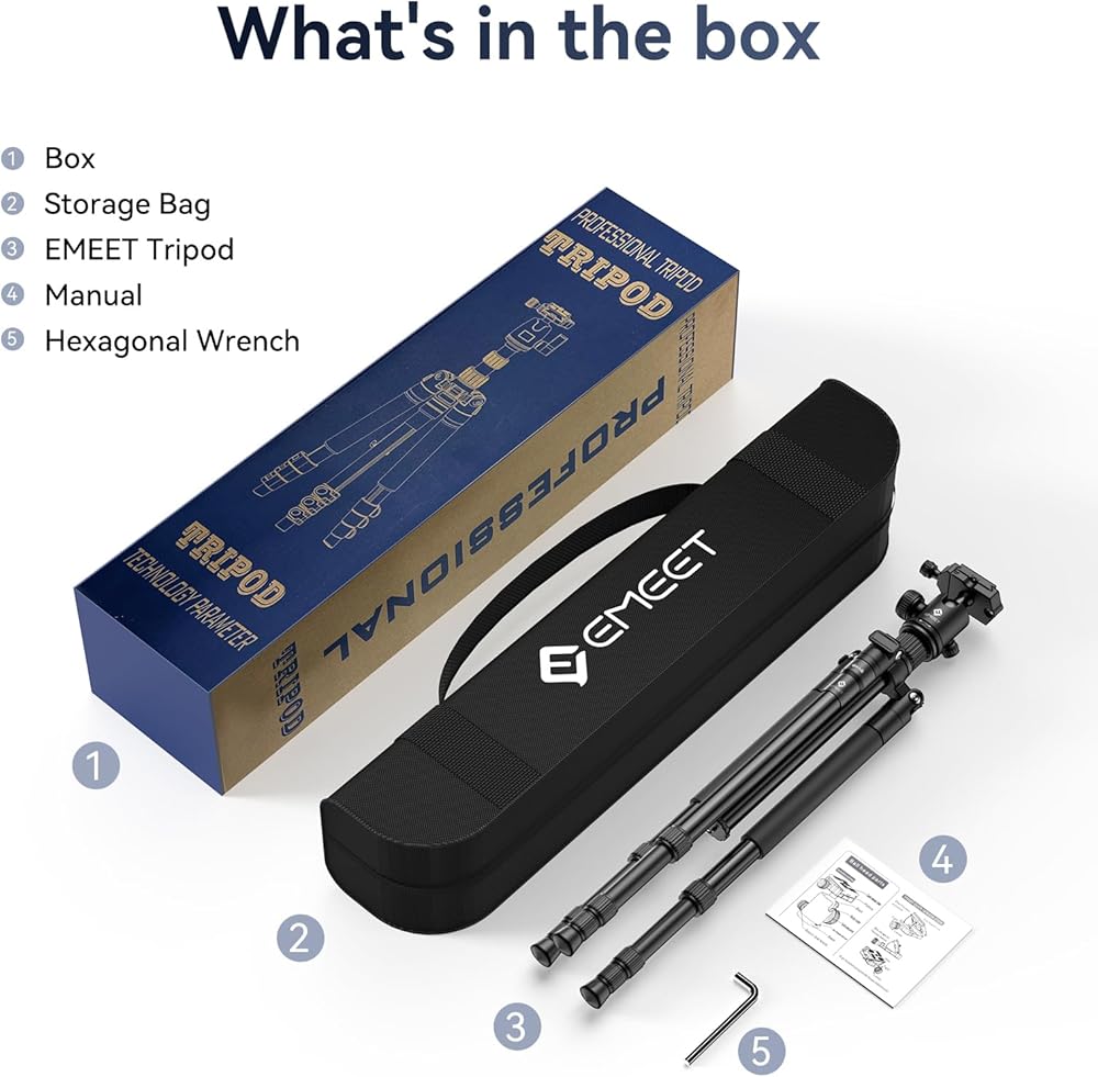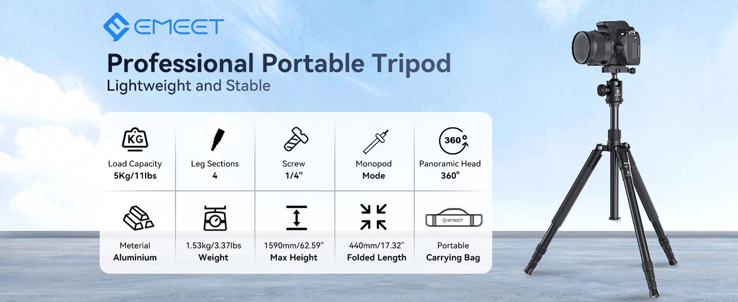 [Lightweight and Durable Travel Tripod] Crafted from high-quality aluminum, the EMEET camera tripod tips the scales at a mere 3.37 lbs/1.53 kg while boasting a maximum load capacity of 11 lbs/5 kg. It even features a built-in hook, allowing you to conveniently hang a bag from the tripod during your travel photography adventures. What's more, this camera tripod can be easily folded down to a compact 17.32-inch size, making it a breeze to carry with the included carrying bag.