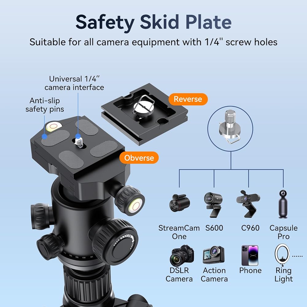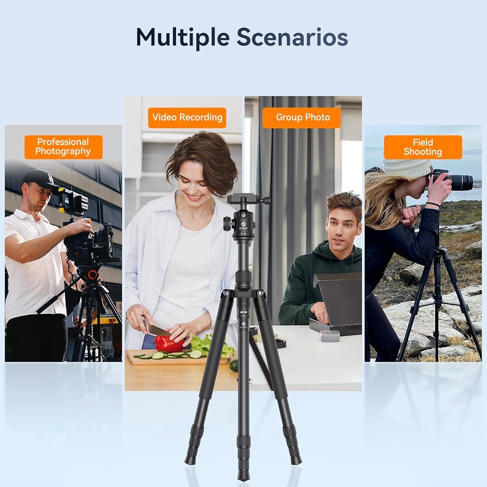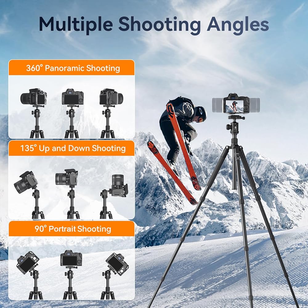 [Adjustable Angles with a 360° Panoramic Ball Head] Engineered with a precision metal ball head, this tripod provides your camera with the flexibility to rotate a full 360° for capturing breathtaking panoramic shots. It can also tilt up to 120° for versatile up-and-down or portrait photography. The aluminum alloy quick-release ball head comes equipped with three built-in bubble levels to ensure your camera remains perfectly aligned.