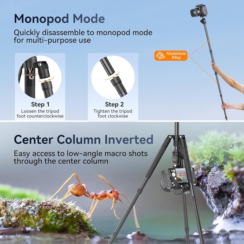 [Macro Photography Capabilities] For enhanced versatility, the telescopic center column of this tripod can be reversed, enabling you to capture low-angle shots and macro photography for getting up close and personal with your subjects. The central column's length can also be extended by using the knob system, allowing you to capture shots from even more unique angles.