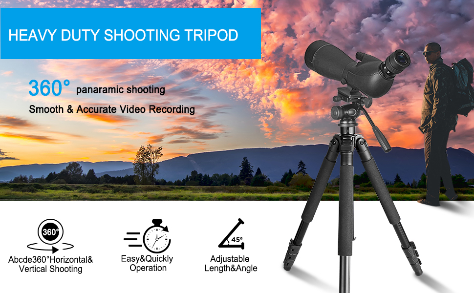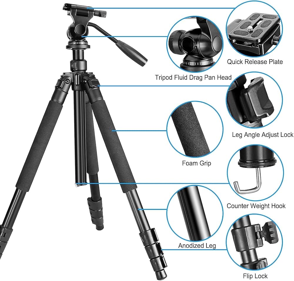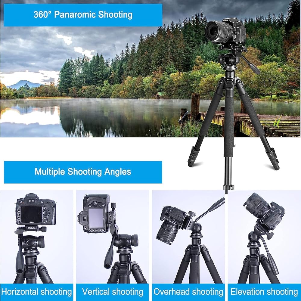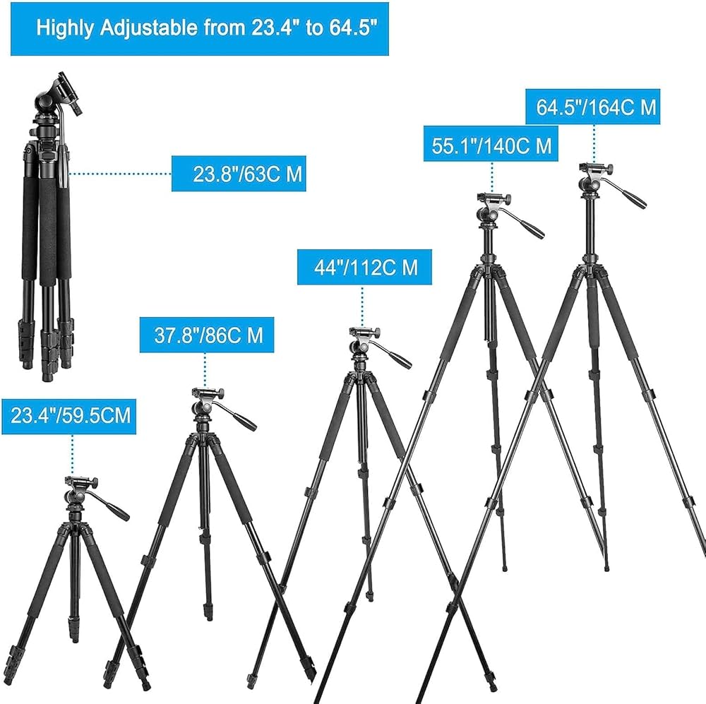 حامل ثلاثي القوائم بقفل رفرف شبه منحرف تم تعديله بحرية من 23 بوصة و64.5 بوصة في بضع ثوانٍ لتلبية متطلبات الارتفاع المختلفة لمجموعة متنوعة من بيئات التصوير واحتياجات التصوير الفوتوغرافي. تم تجهيز حامل الكاميرا ثلاثي القوائم المدمج برأس مستقر ومريح بثلاثة اتجاهات: قفل الرأس، وقفل المقلاة، وقفل الإمالة، والذي يمكن أن يلبي جميع احتياجات التصوير الفوتوغرافي الرأسي والأفقي والعلوي، إلخ.
