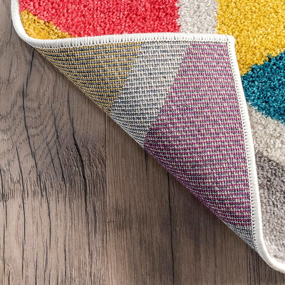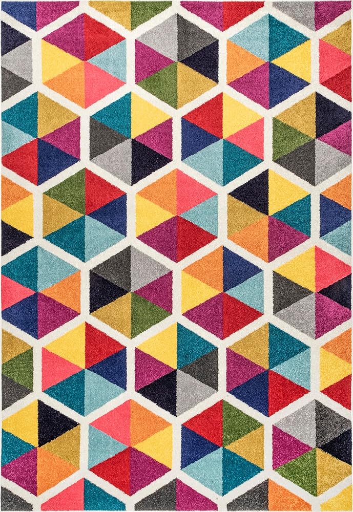 Whether you're searching for an abstract design or a fun rug for your child's bedroom, this geometric area rug will be the finishing touch. Machine-made from durable, easy to clean polypropylene fibers, this floor covering features an array of bold vibrant colors. Get ready to turn heads with our pet-friendly and easy to care for area rugs.