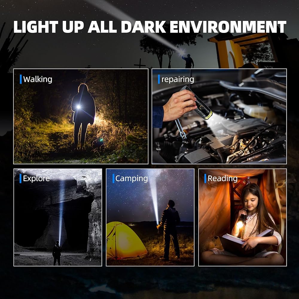 【مصباح يدوي LED فائق السطوع】يستخدم المصباح اليدوي التكتيكي الخاص بنا رقاقة LED مطورة عالية الإخراج توفر إضاءة قوية 10000 لومن. أكثر سطوعًا 10 مرات من المصباح اليدوي العادي وأكثر سطوعًا 8 مرات من مصباح XHP50. يمكنه بسهولة إضاءة غرفة تصل إلى 140 متر مربع، مع مسافة شعاع قصوى تصل إلى 1000 متر (3280 قدم). لا تتردد في الحصول على واحدة إذا كنت تبحث عن معدات فائقة السطوع وطويلة الأمد تحول الليل إلى نهار في مغامراتك الخارجية (والداخلية)