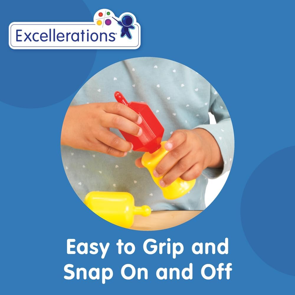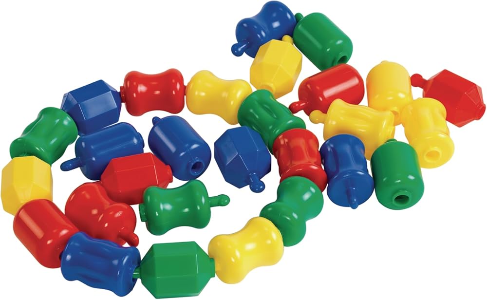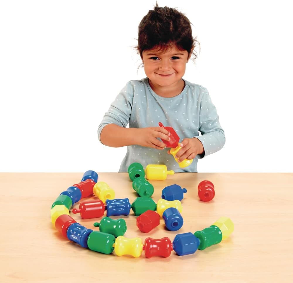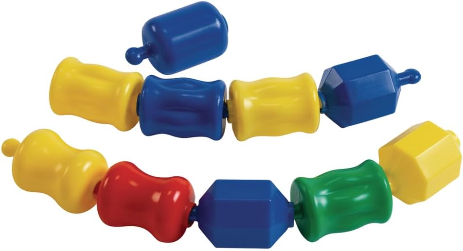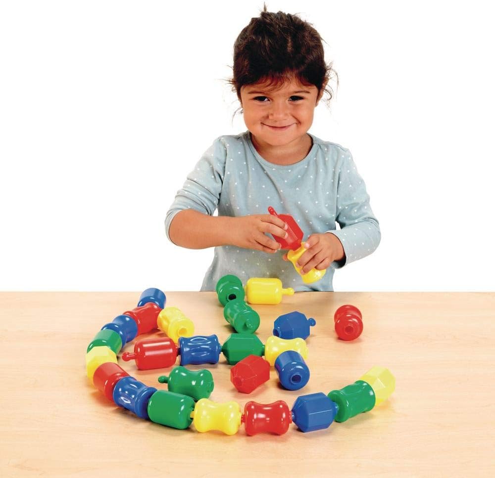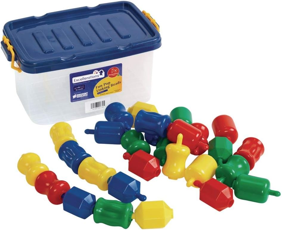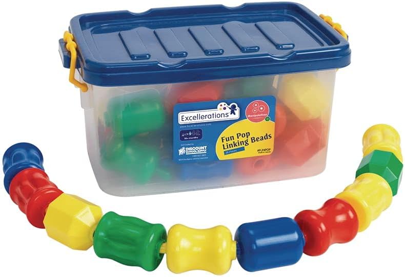 "Excellerations Fun Pop Linking Beads will keep young children engaged in learning activities by having fun! The set of 28 bright plastic beads come in four vibrant colors – blue, yellow, red, green - and a variety of shapes. An early STEM toy, linking beads are a fun and instructive manipulative that promotes thinking, design, fine motor skills development and enhances eye-hand coordination. The sturdy carrying storage box lets you easily take the bead set anywhere to entertain kids on-the-go while making it easy to clean up and use at home, in school, or at a day-care center. Makes a great gift! Sized for small hands ages 18 months and up, 3” long easy-to-link beads securely connect to each other to create simple chains and unique creations. They are made of durable plastic that can stand-up to excited toddlers and preschoolers and be easily wiped clean of any kid-sized messes. This classic toy will provide hours of enjoyment for even the youngest creators. "