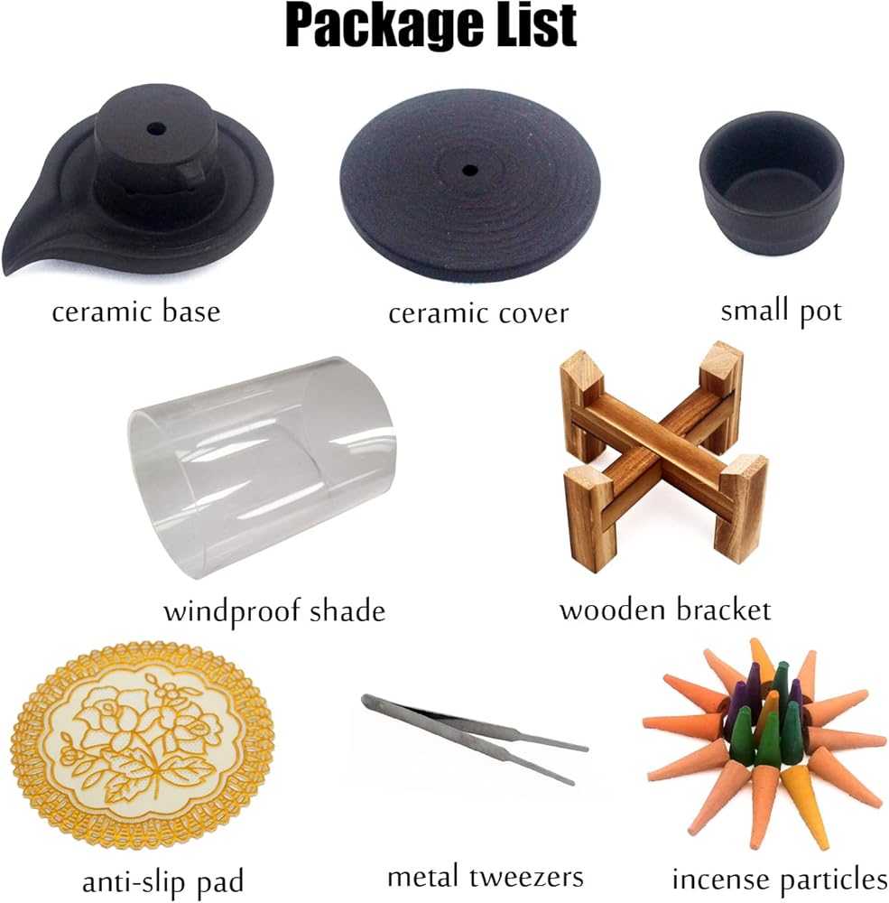 【Package Includes】1 ceramic cover, 1 ceramic base, 1 windshield, 1 small pot, 1 wooden bracket, 1 anti-slip pad, 1 tweezers, and 1 bag of upgraded incense particles (about 20)
