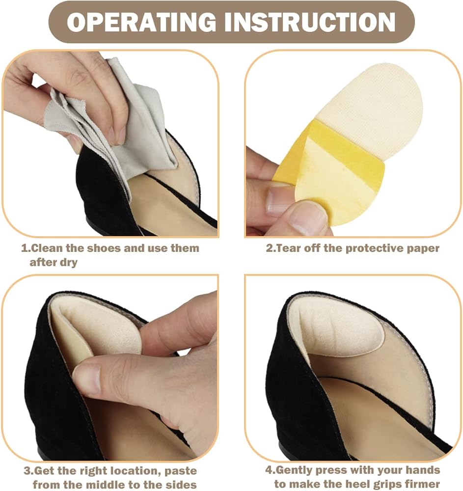 Easy To Use : These heel cushions have super sticky backing.You need to clean the area where they will be used, then remove the adhesive cover from the heel cushions, put them on it and press them firmly. Can be cleaned and reused.