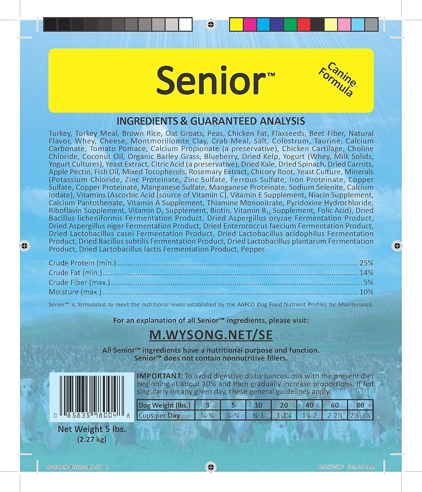 No canine senior diet on the market has proven itself like Wysong Senior dog food. It was created by Dr. Wysong and owes its popularity solely to veterinary recommendation and word of mouth. Senior has been fed to tens of thousands of canines through multiple generations for over thirty years with great success. This improved formulation is designed to take advantage of new processing methods to preserve natural value, and nutritional advances in epigenetics and nutrigenomics. Senior has increased levels of high quality meats, organs, protein, and fat, and contains a comprehensive spectrum and higher levels of micronutrients/nutraceuticals including prebiotics, probiotics, enzymes, omega-3s, antioxidants and more. Small quantities of fruits and vegetables mimic what may be consumed in the viscera of prey, and contribute important vitamins, minerals, antioxidants and other nutrients. Premium high quality nutrition is extremely important with aging digestion, physiology, and immune function, and this is what Senior provides. As always, for best results rotate Senior with fresh foods, Wysong TNT raw dog foods and other healthy Wysong pet diets.