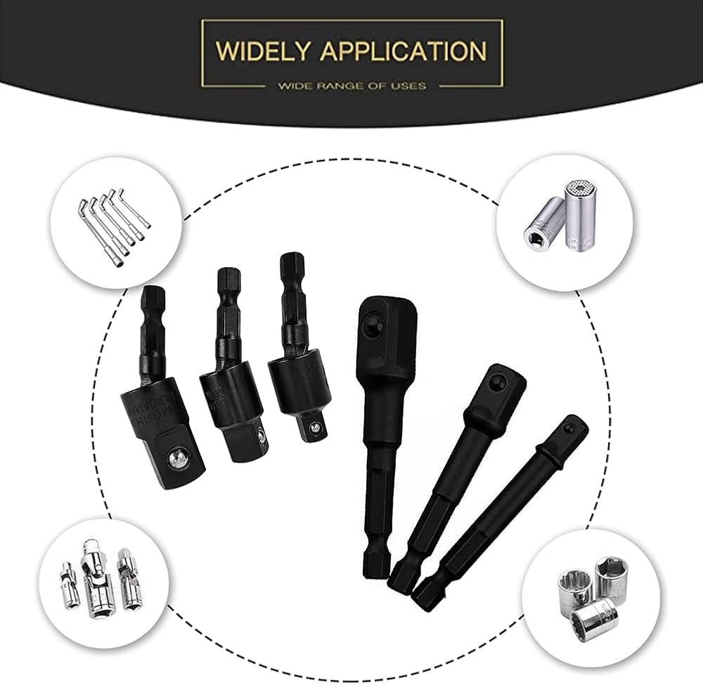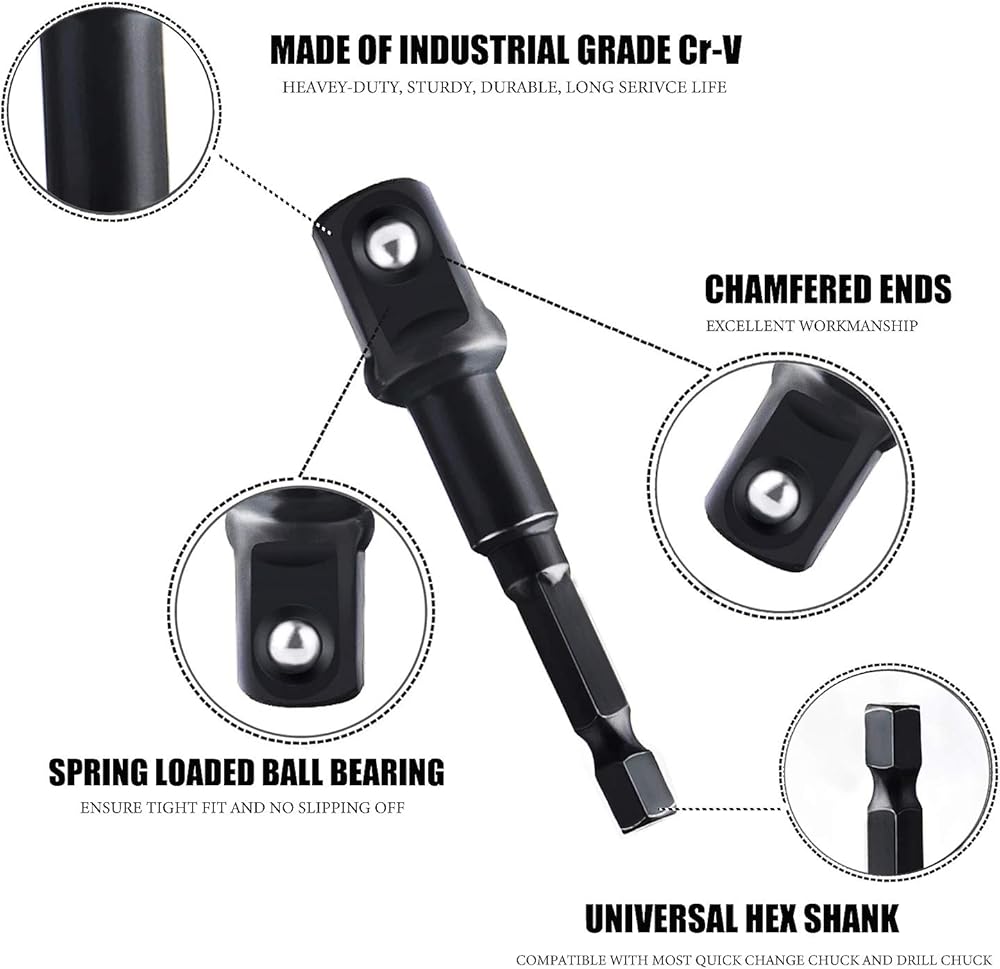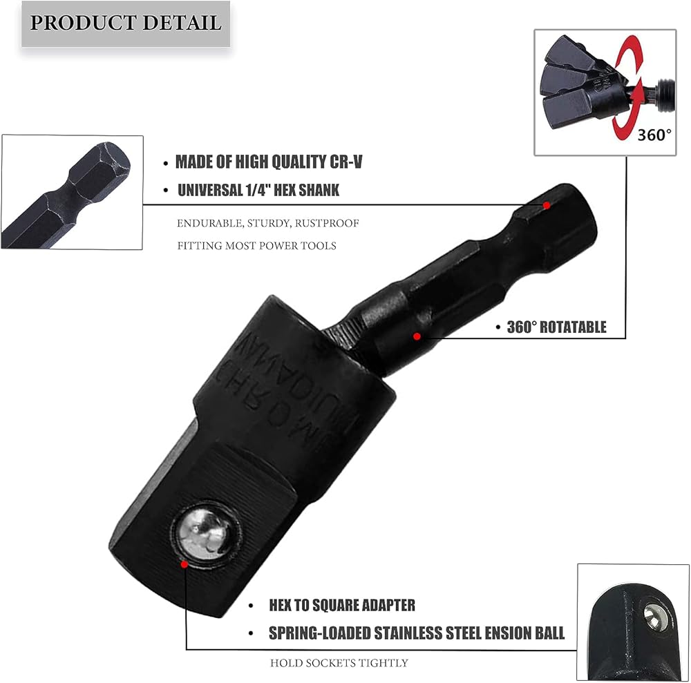 ✮[PREMIUM MATERIAL]-This drill bit extension set includes 6PCS impact socket adapters with 1/4” hex shank made of heavy-duty chrome-vanadium steel, durable, sturdy, ensuring long use;