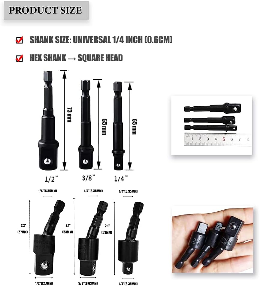✮ [3 PCS SWIVEL BITS-360 DEGREE ROTATABLE]-360 degree rotatable socket adapter adopts a special spherical design, which can evenly distribute the torque load on a greater surface area; Allow access to a narrower workplace, convenient to use, effort-saving, significantly improves work performance; Specifically designed for impact use, featured with spring-loaded detent balls to hold sockets securely in place. Sockets Snap-On Tightly and Won't Slip Off. A must-have tool set in your tool box;