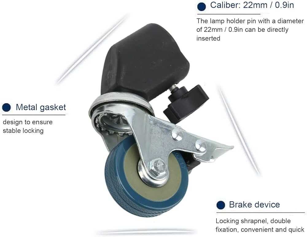 METAL GASKET: Studio swivel wheels are designed with metal spacers, which are firmly locked and can be used with confidence. The gauge is 22mm, and the 22mm diameter light holder pin can insert it directly for use.