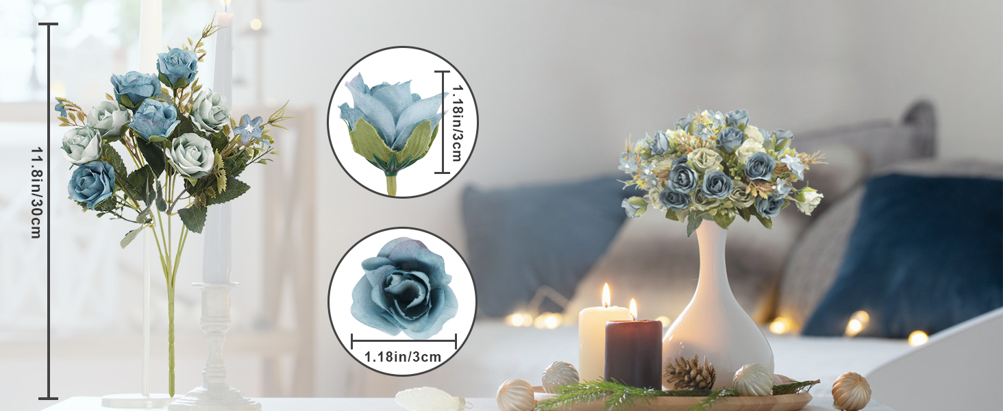 الحجم: يبلغ ارتفاع الوردة الزرقاء من الأسفل إلى الرأس 11.8 بوصة. يبلغ قطر كل برعم حوالي 1.18 سم.