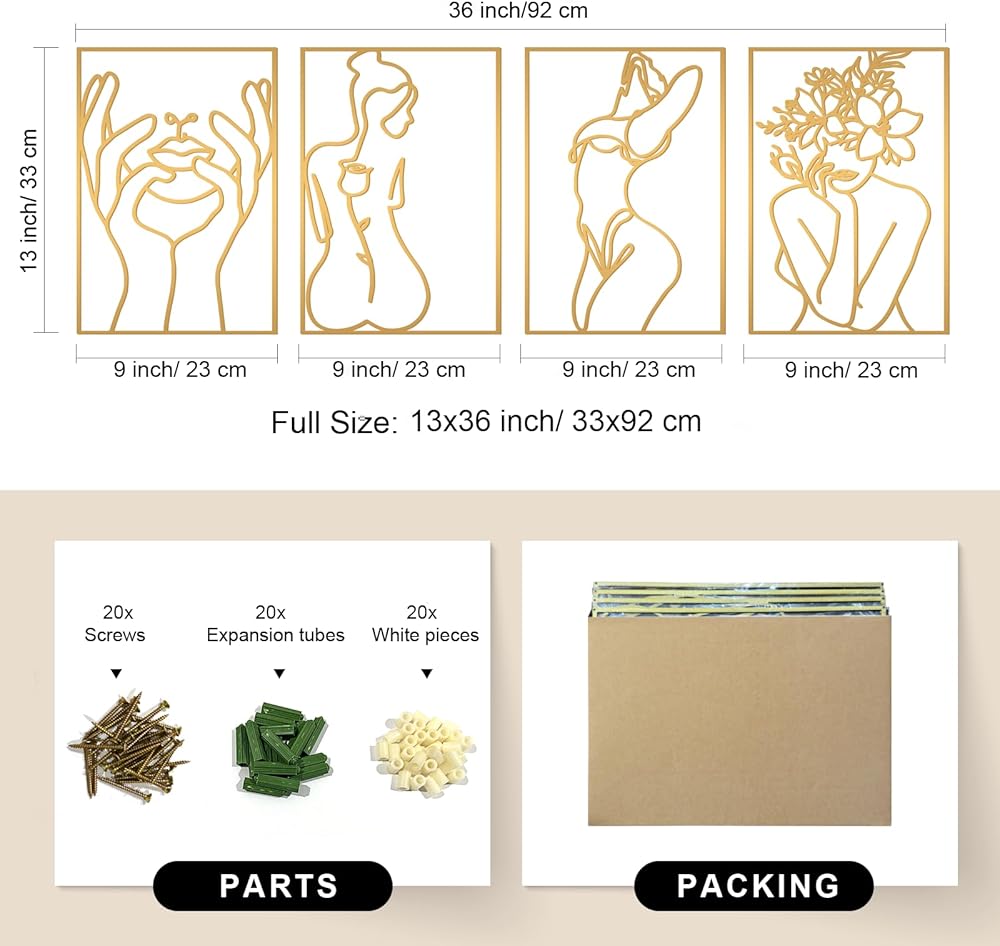 Glamativity Small 4 عبوات من ديكورات الحائط الذهبية، ديكور بسيط، ديكور جداري فني بخط واحد، فن جداري معدني حقيقي، شكل جسم المرأة ديكور جدار تجريدي (نمط كلاسيكي ذهبي، مقاس S 13 × 9 بوصة)