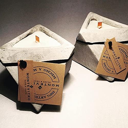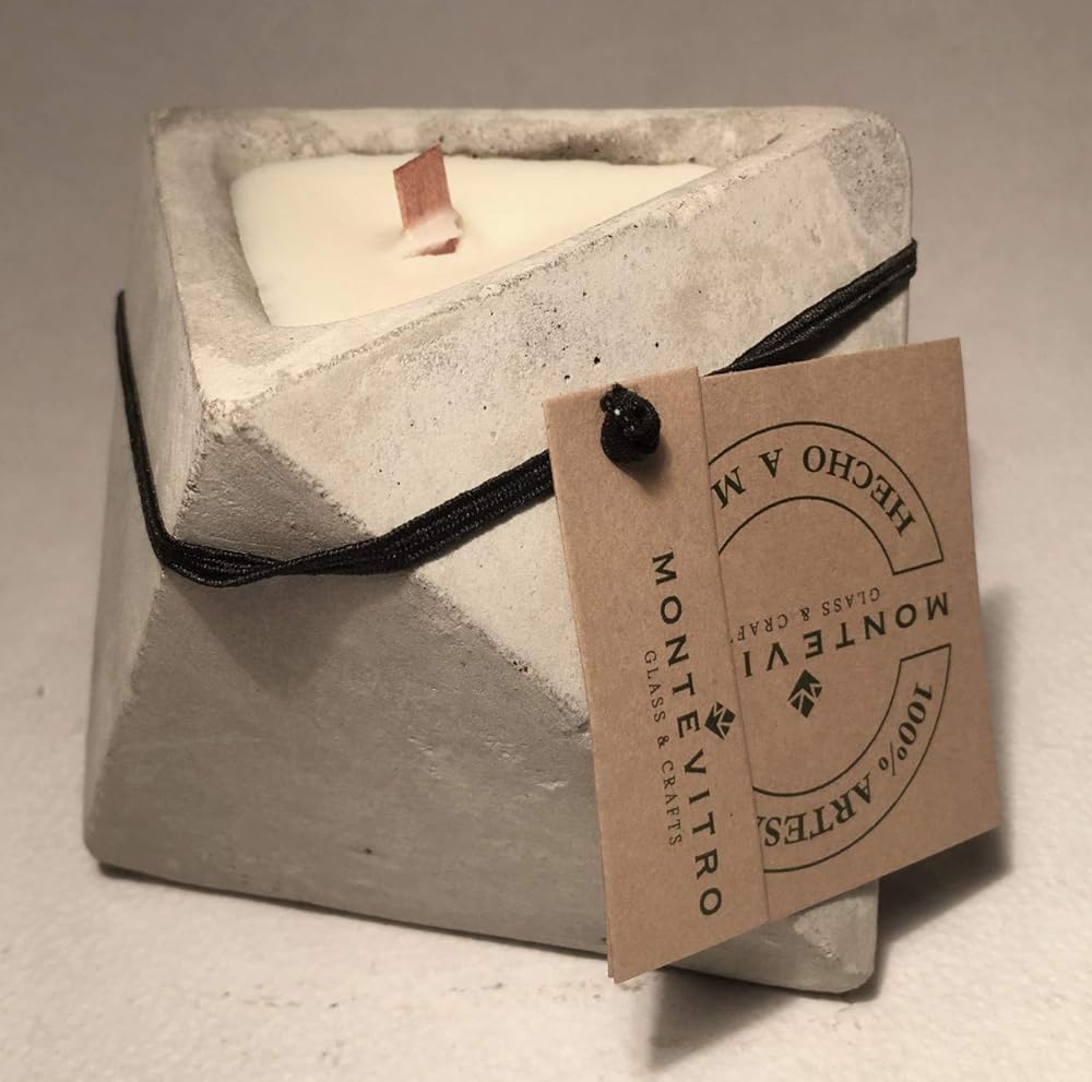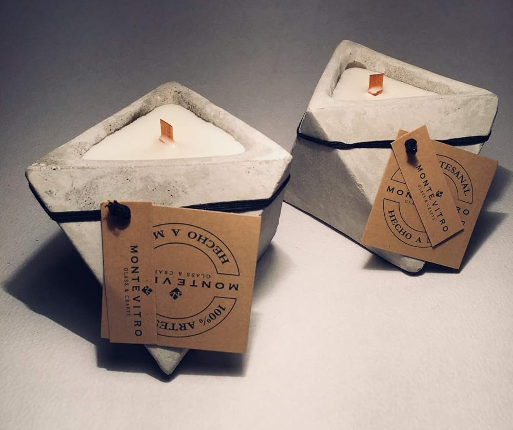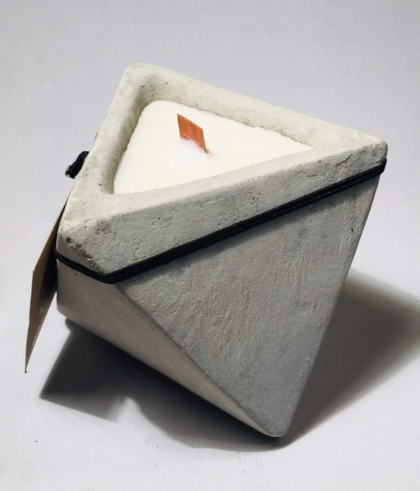 SET with 2 Aromatic candles, made in concrete bases in the form of a triangle. Excellent handcrafted candles as decoration, modern, practical. Made 100% by hand, with organic soy wax and ecological wooden pabilos to expand the aromas to a greater distance achieving a longer duration of the fragrances in the environment. Measures 3" X side X 3" height. Beautiful for interior and exterior, they were manufactured with the sustainability of the environment in mind.