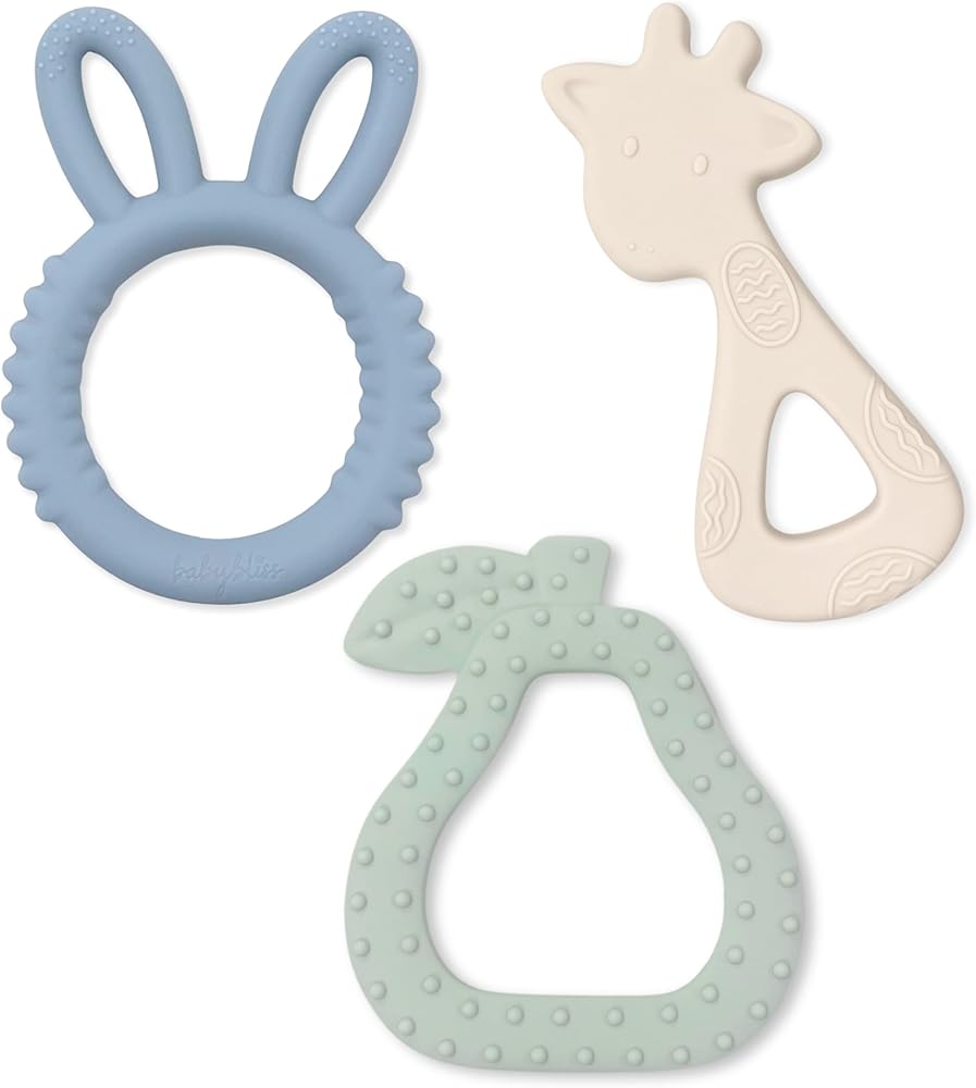 Baby Bliss 3 pack newborn teething toys: Our baby and toddler teething toys feature a bunny, giraffe and pear for baby chew toys teething. Each infant teether makes for a thoughtful baby essentials 3-6 months + gift, ensuring a safe and enjoyable teething experience for newborns. Check out our best teething toys for babies 0-6 months +. We're sure you and your little one will love our non toxic teething toys!