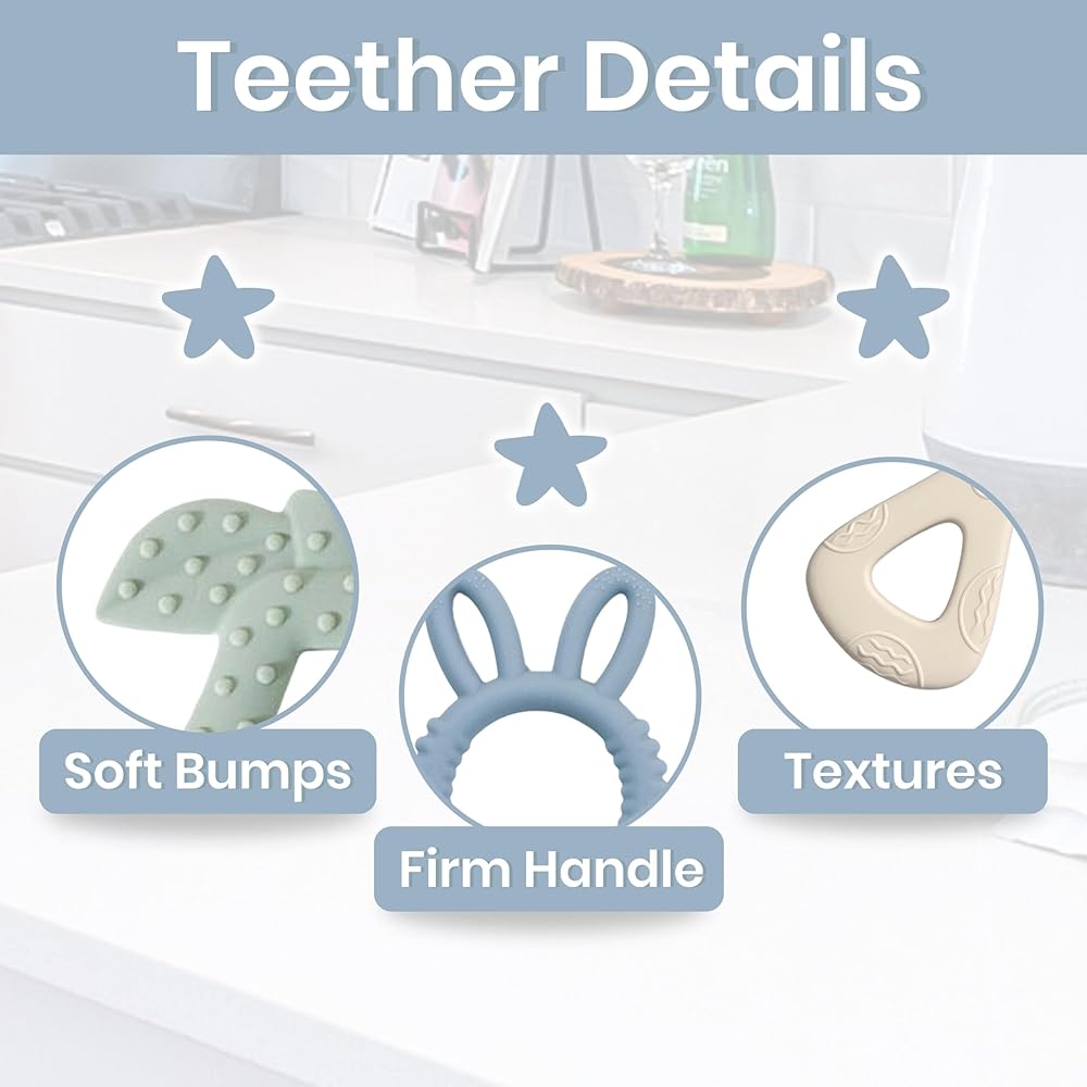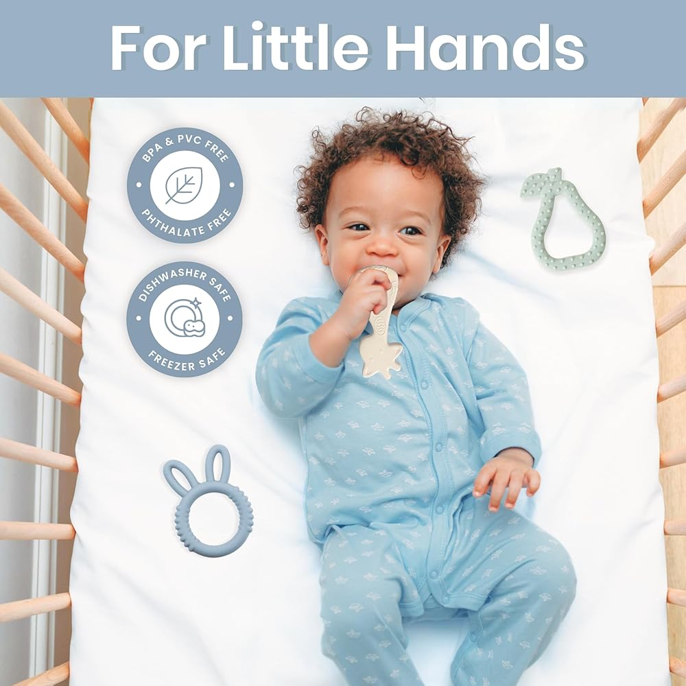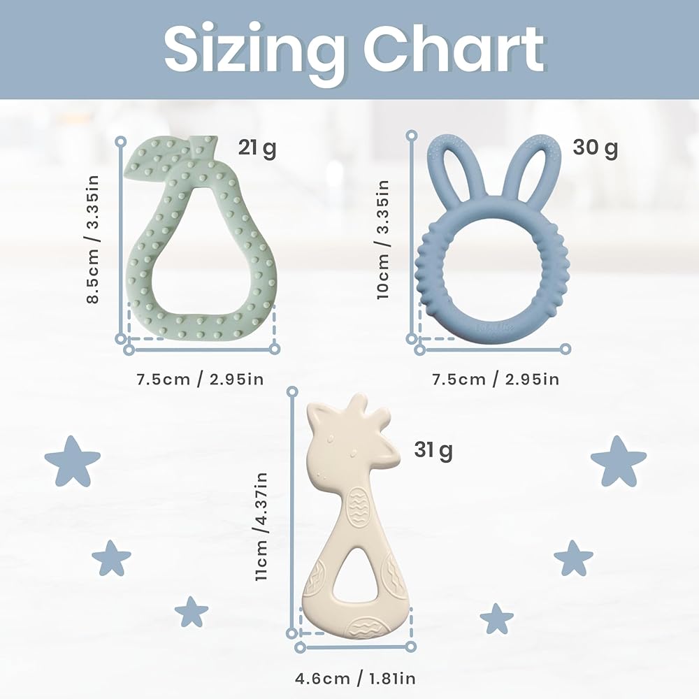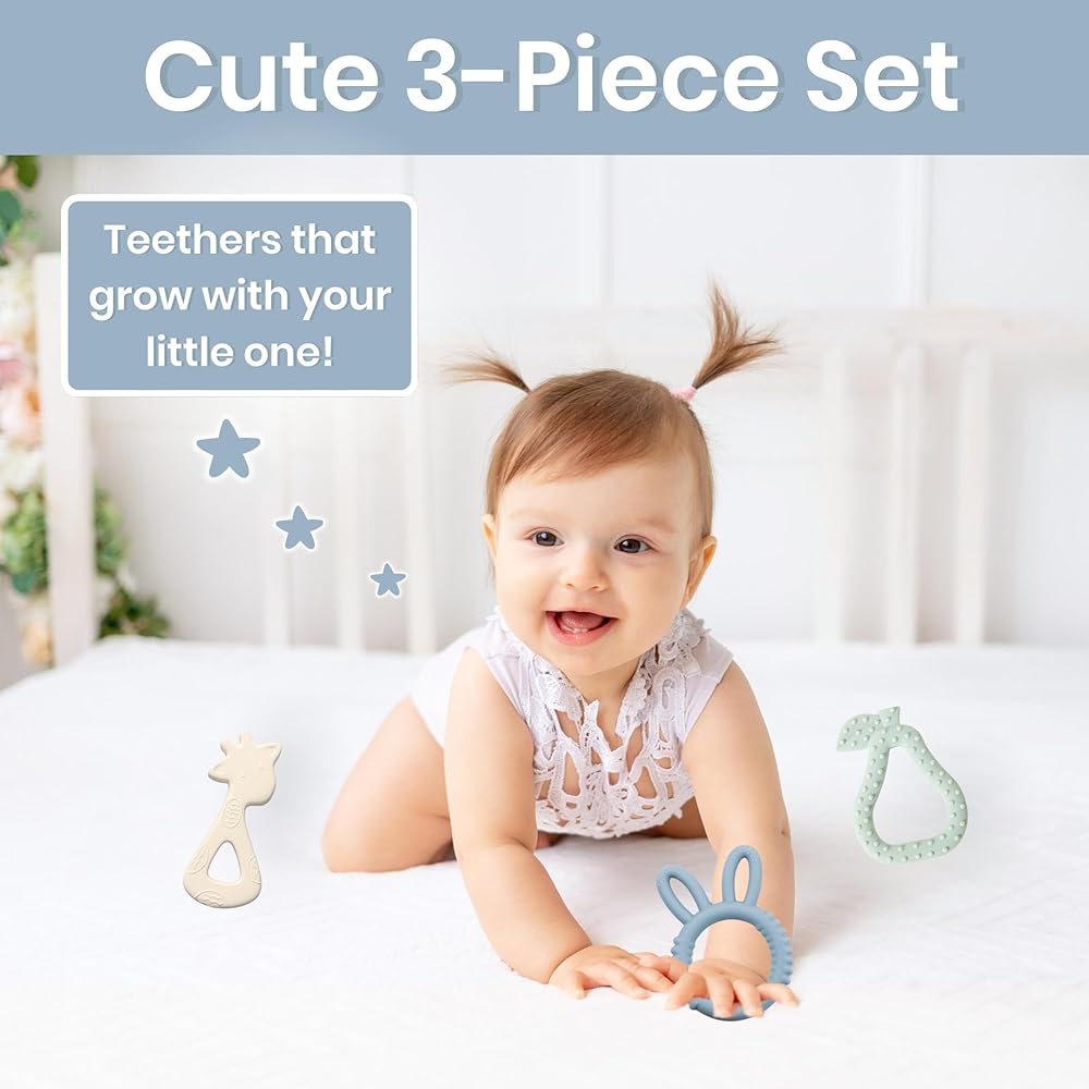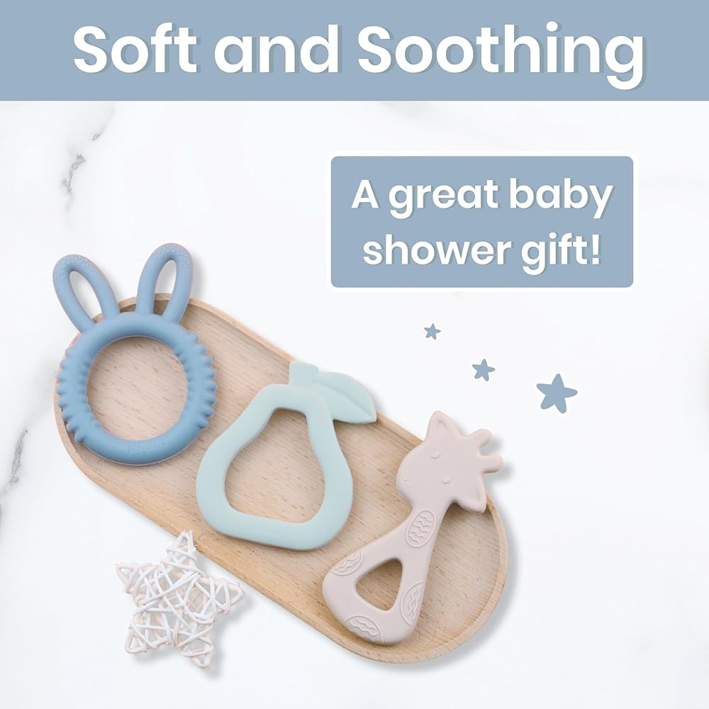 ⭐ Silicone Teether Set: Baby teethers that have a balance of soft and firm textures and cute shapes for enjoyable chewing. Aid your baby's teething discomfort with a soothing molar teether mix for baby teething relief. Your little one will love our giraffe, bunny, and pear fruit teethers for babies.