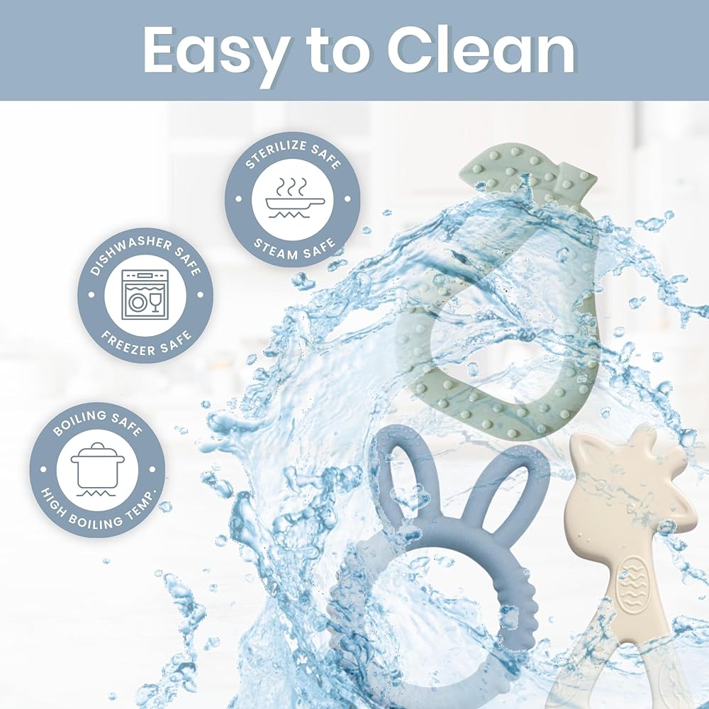 ⭐ Easy to Clean: Our baby chew toys are dishwasher safe, freezer safe and hypoallergenic. Perfect freezer teething toys that relieve gum swelling for extra comfort. Simply add to the freezer for 10 minutes for a cooling sensation for your baby.