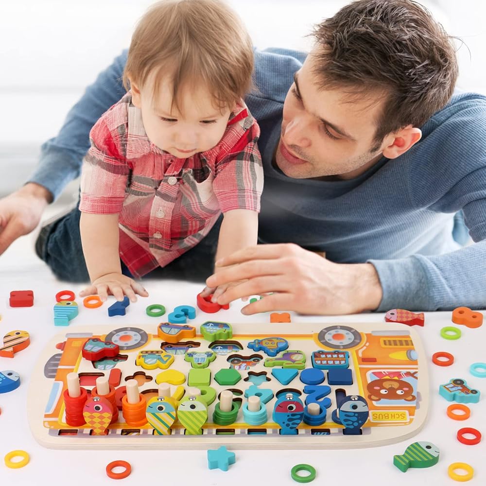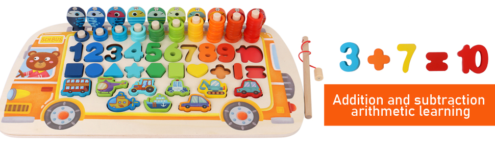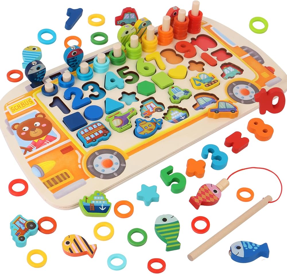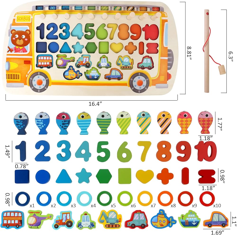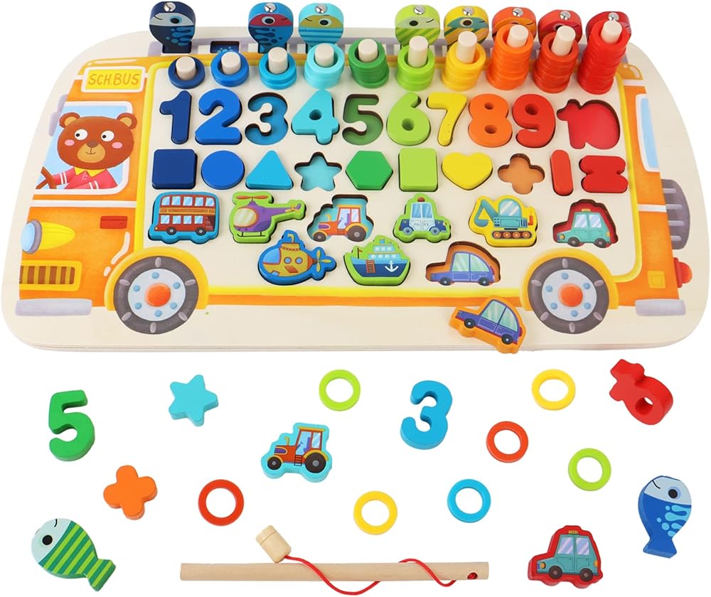 • [مظهر ومحتويات فريدة] تتميز اللعبة على شكل حافلة بمظهر فريد حيث ينجذب الأطفال إلى شكل الحافلة ومحتوياتها. تحتوي على لعبة الأسماك المغناطيسية، وتكديس حلقات ملونة مختلفة، وألغاز مطابقة الشكل والنقل ولعبة مطابقة الأرقام. وهذا يساعد على تعزيز القدرات المنطقية وكذلك حل الأرقام لدى الأطفال