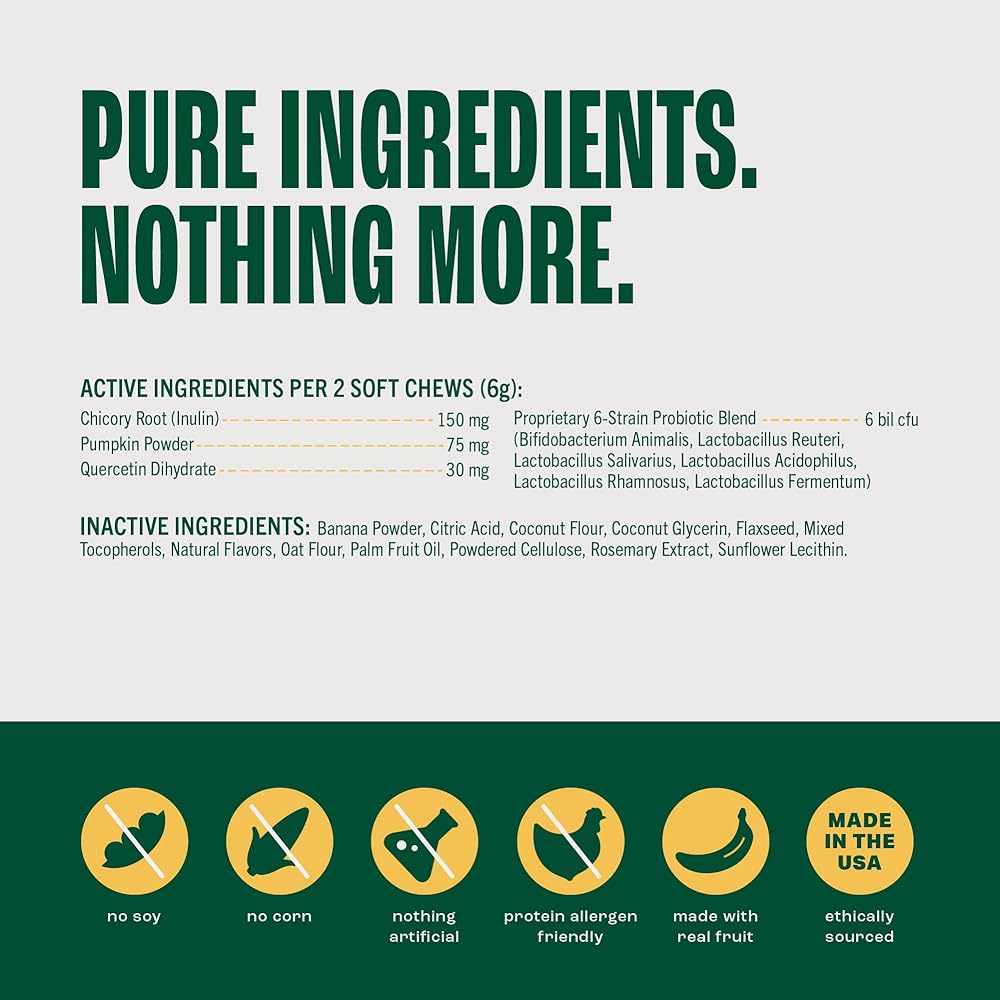 دعم صحة الوعاء السليم - تشتمل هذه المضغات المسبقة والبروبيوتيك للكلاب على كيرسيتين للمساعدة في تعزيز وظيفة الحاجز المعوي، والقرع اللذيذ لتخفيف آلام المعدة العرضية (الإسهال أو الغازات أو الإمساك) في أي سلالة، صغيرة أو كبيرة.