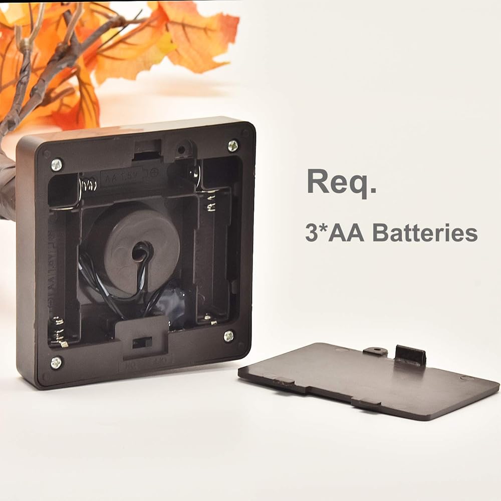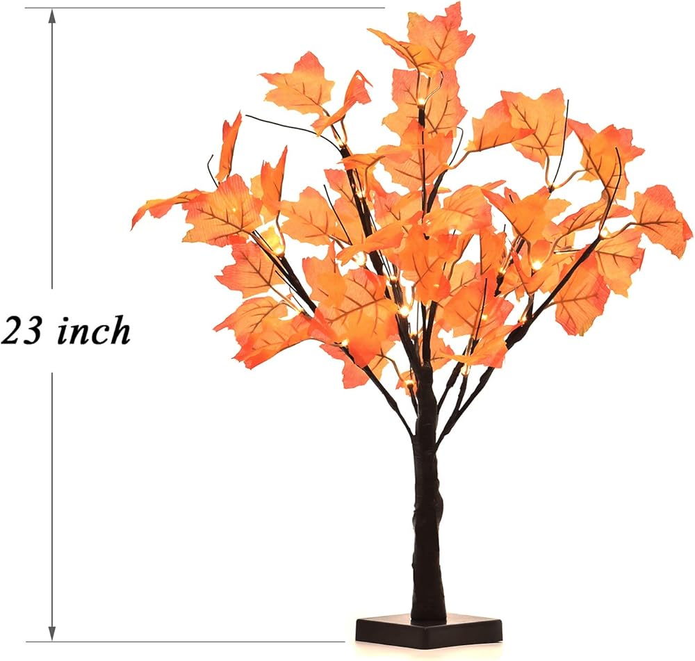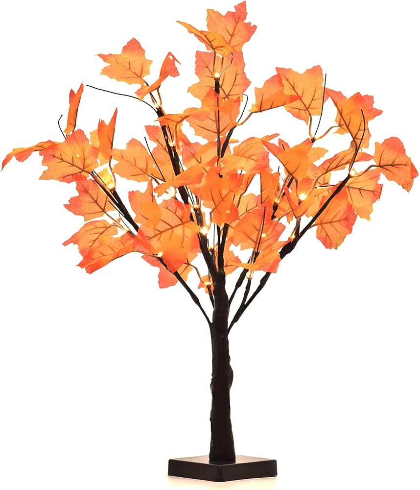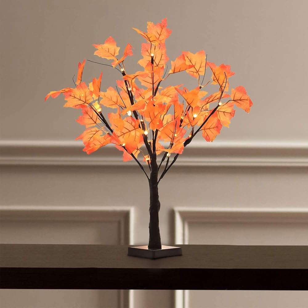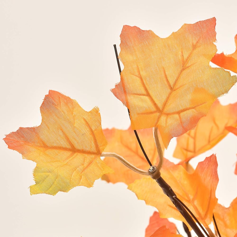 اللون: أوراق القيقب البرتقالية، ضوء LED أبيض دافئ، سيقان بنية وجذع.