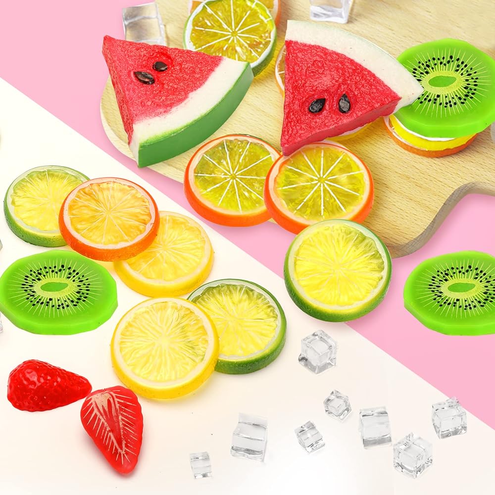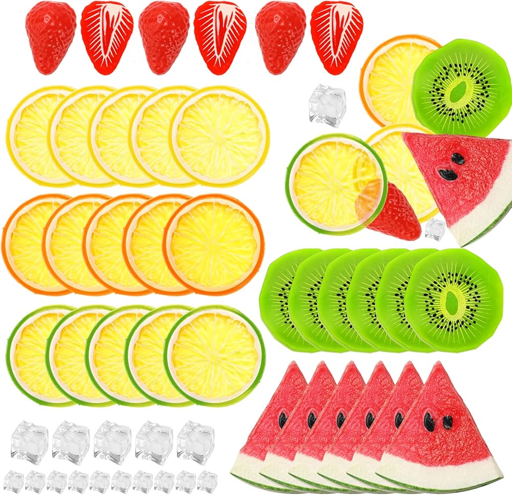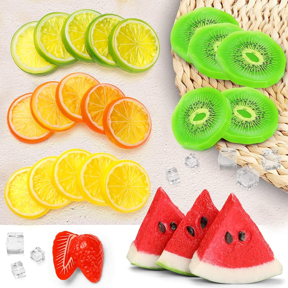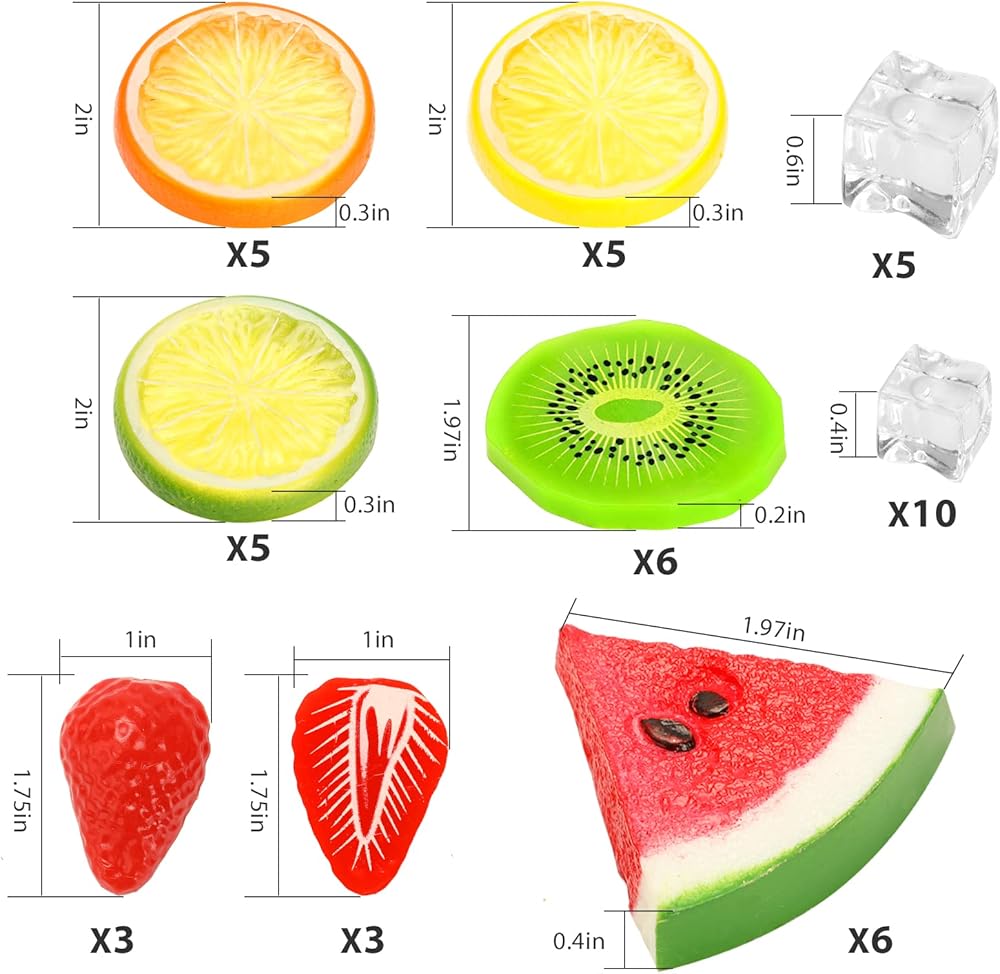 مجموعة فواكه بلاستيكية مزيفة مكونة من 48 قطعة من رويزيهو مكونة من 5 مكعبات ثلج و10 قطع من الثلج المجروش و15 شريحة ليمون و6 فراولة و6 شرائح بطيخ و6 شرائح كيوي