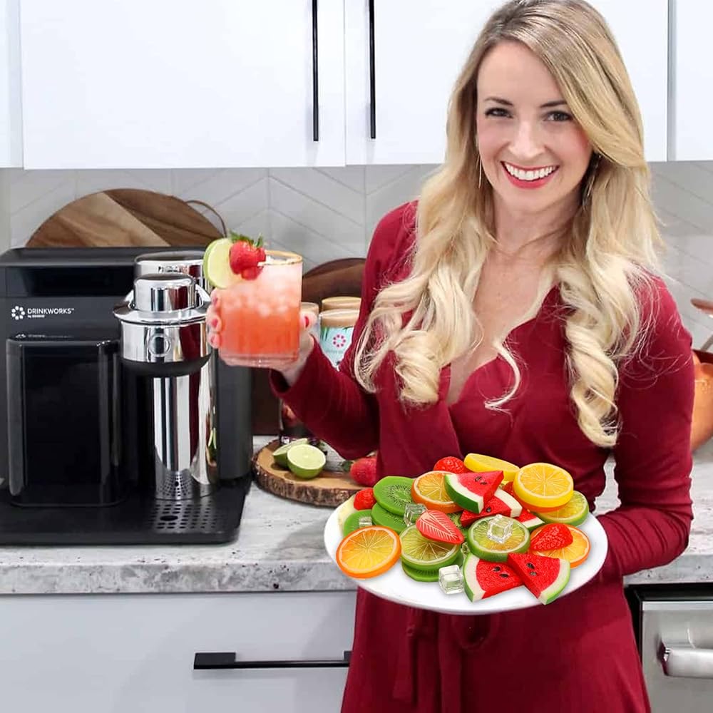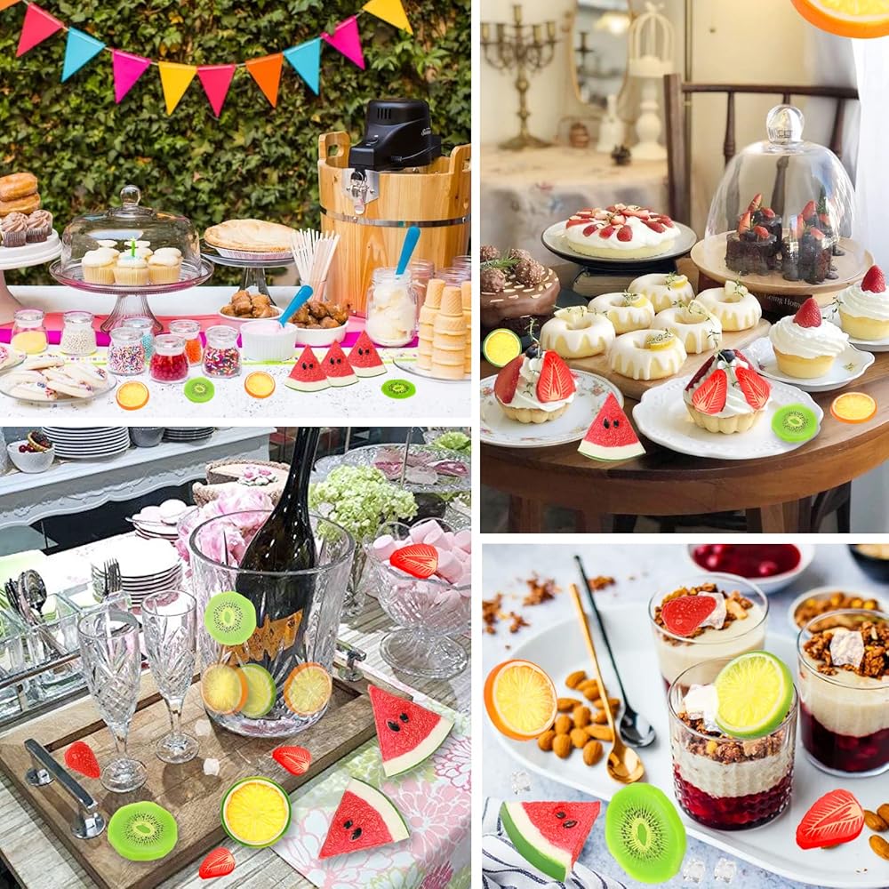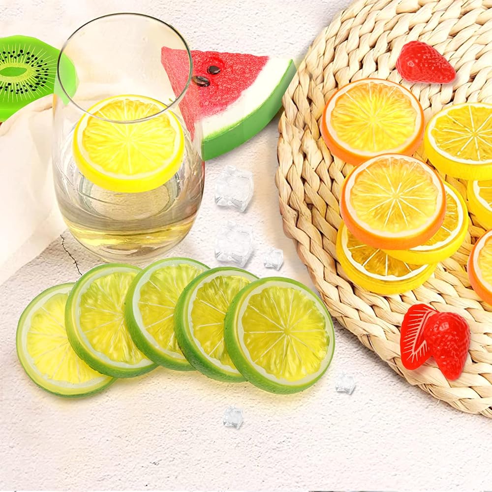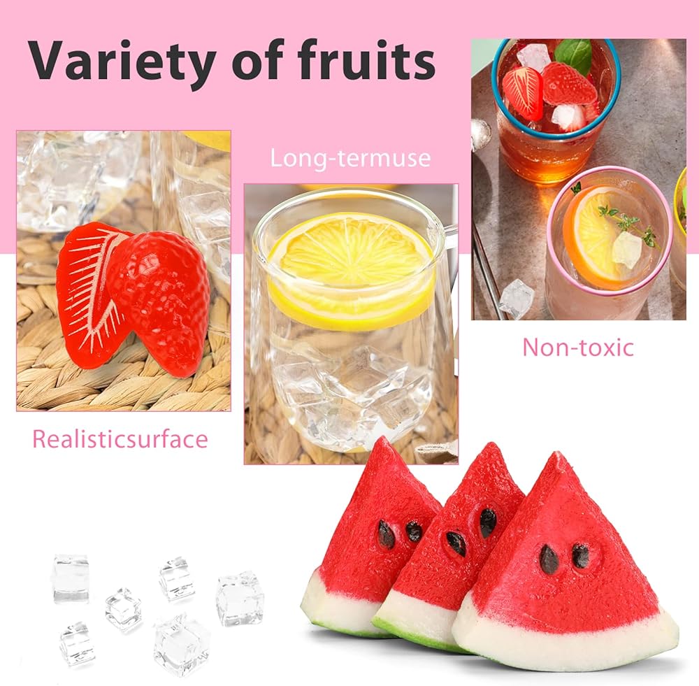 مجموعة فواكه بلاستيكية مزيفة مكونة من 48 قطعة من رويزيهو مكونة من 5 مكعبات ثلج و10 قطع من الثلج المجروش و15 شريحة ليمون و6 فراولة و6 شرائح بطيخ و6 شرائح كيوي
