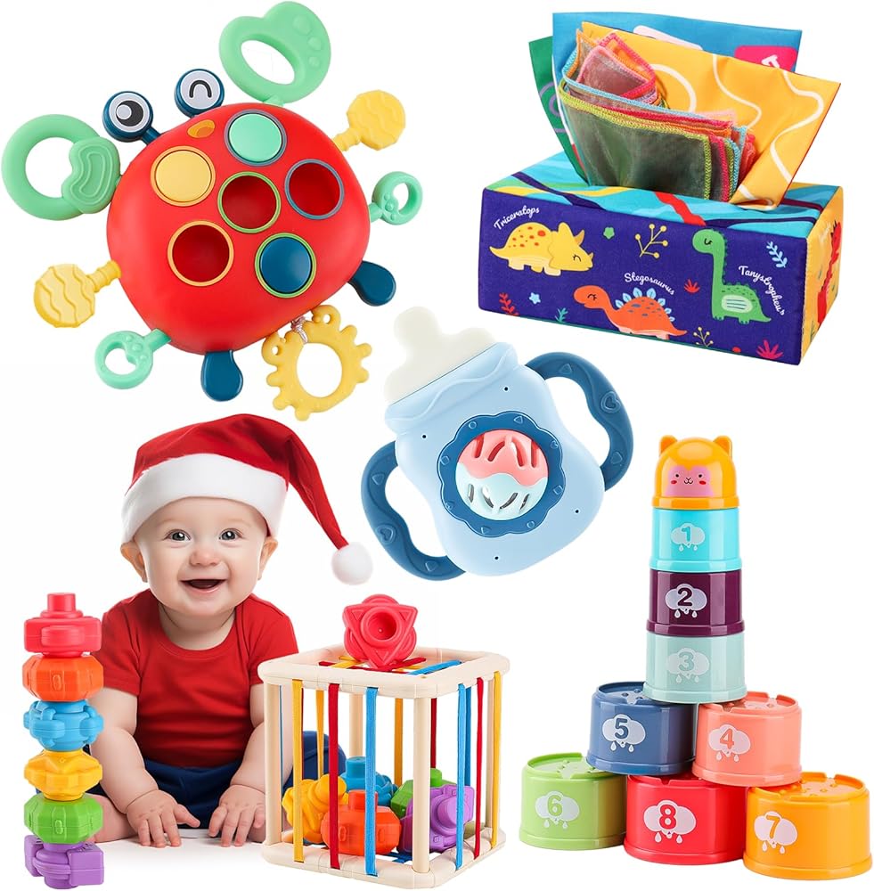 kadayaya مونتيسوري لعبة الطفل لمدة 6 12 18 شهرا، لعبة عضاضة خشخيشة صندوق الأنسجة سحب سلسلة لعبة السلطعون، اللعب الحسية الرضع شكل صندوق تخزين، التراص لعبة الكأس هدية للأطفال الصغار الفتيان الفتيات 1 2 3 سنة من العمر