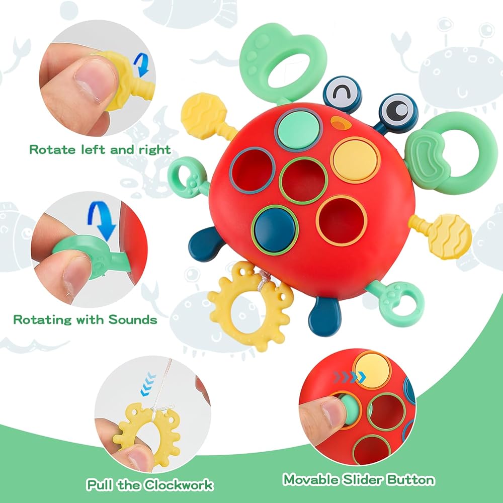 • ألعاب سحب السلطعون مونتيسوري: مصنوعة من السيليكون وABS، هذه اللعبة الحسية لسرطان الأطفال مصممة لمهارات الطفل الحركية الدقيقة. 3 أزرار ضغط قابلة للانزلاق لتمرين التنسيق بين اليد والعين لدى الطفل. ذراع عضاضة بخيط سحب يجعل لثة التسنين أكثر راحة. اسحب الخطاف لأعلى ولأسفل لإصدار الأصوات وهز عيون لعبة السلطعون.