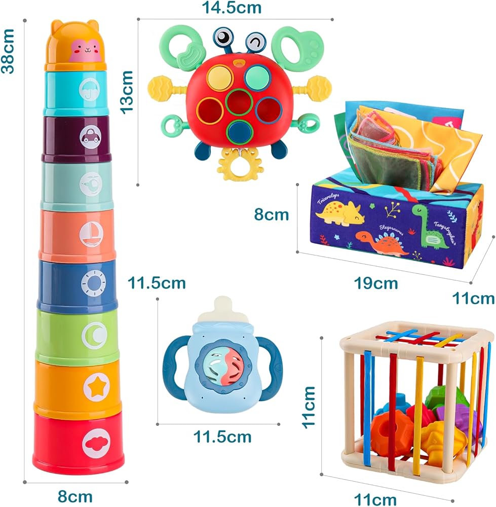 • ألعاب مكعب للأنشطة لفرز الأشكال: تتضمن مجموعة ألعاب الأطفال هذه 6 مكعبات أشكال ملونة ومكعب شريط مطاطي. اجعل الأطفال مشغولين بأخذ المكعبات المزخرفة داخل وخارج المكعب. تعمل أدوات فرز الأشكال ذات الأصوات الواضحة والأنسجة المختلفة على استكشاف الإدراك الحسي والصوتي للطفل. ألعاب حسية مثالية للطفل من عمر 12 إلى 18 شهرًا.