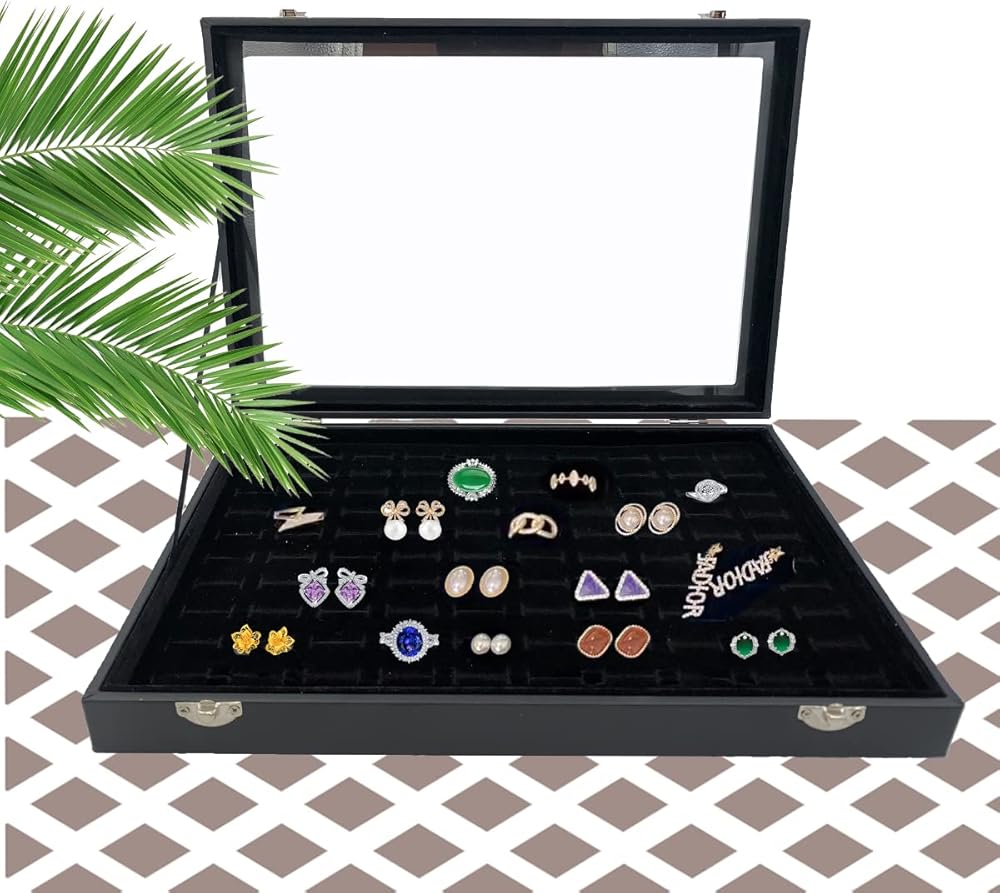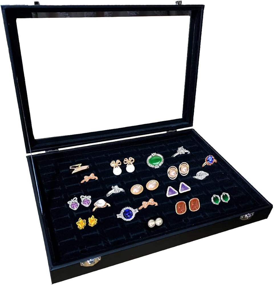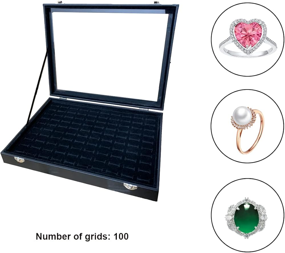 صينية تنظيم المجوهرات بغطاء شفاف، صندوق تخزين الخواتم 100 فتحة مع غطاء شفاف، صندوق تخزين خواتم زجاجي مخملي، صندوق عرض مجوهرات للخواتم المتعددة والأقراط