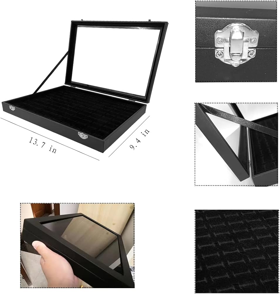 【حافظات عرض للمقتنيات】صندوق المجوهرات الأسود مصنوع من خشب عالي الجودة، مع زجاج شفاف مقوى كغطاء علوي. العبوة الخارجية مصنوعة من البولي يوريثان والمخمل القصير، مع فواصل داخلية قابلة للإزالة ومشبك أمان من خليط معدني، حتى تتمكن من حماية مجوهراتك جيدًا وتجنب الضياع والخدوش.
