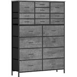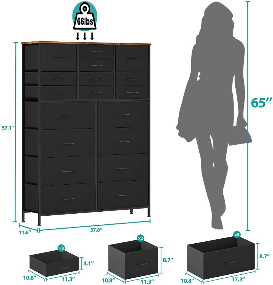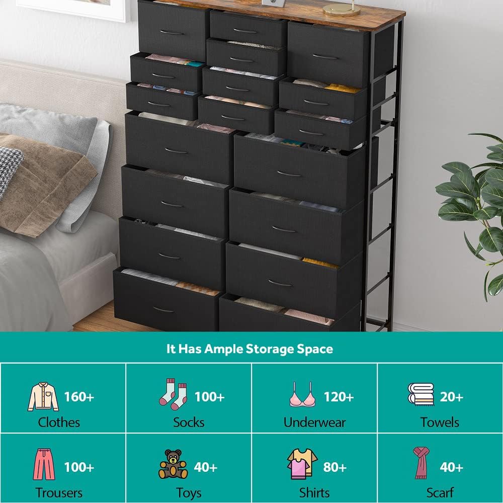 【سعة كبيرة】تحتوي خزانة الملابس الطويلة هذه على 18 درجًا، كل درج في خزانة الملابس هذه يحمل ما يصل إلى 10 أرطال. 8 أدراج كبيرة واسعة للملابس والسراويل والقمصان والجينز والفساتين، ودرجين متوسطين واسعين لربطات العنق والعمامة والأوشحة وغيرها من الملحقات الشخصية، و8 أدراج صغيرة للجوارب والملابس الداخلية وما إلى ذلك. يمكن أن تحمل اللوحة العلوية ما يصل إلى 66 رطلاً تقريبًا من العناصر.
