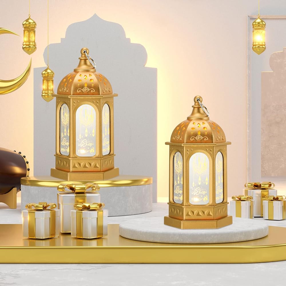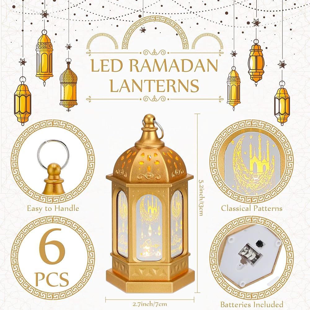 خامة عالية الجودة: فانوس رمضان الذهبي مصنوع بشكل جيد، مصنوع من مادة أكريلونتريل بوتادين ستايرين، قوي ومقاوم للخدش، ويأتي مع زجاج مرآة بنمط رمضان الرقيق من 6 جوانب بحيث يمكن وضعه لفترة طويلة