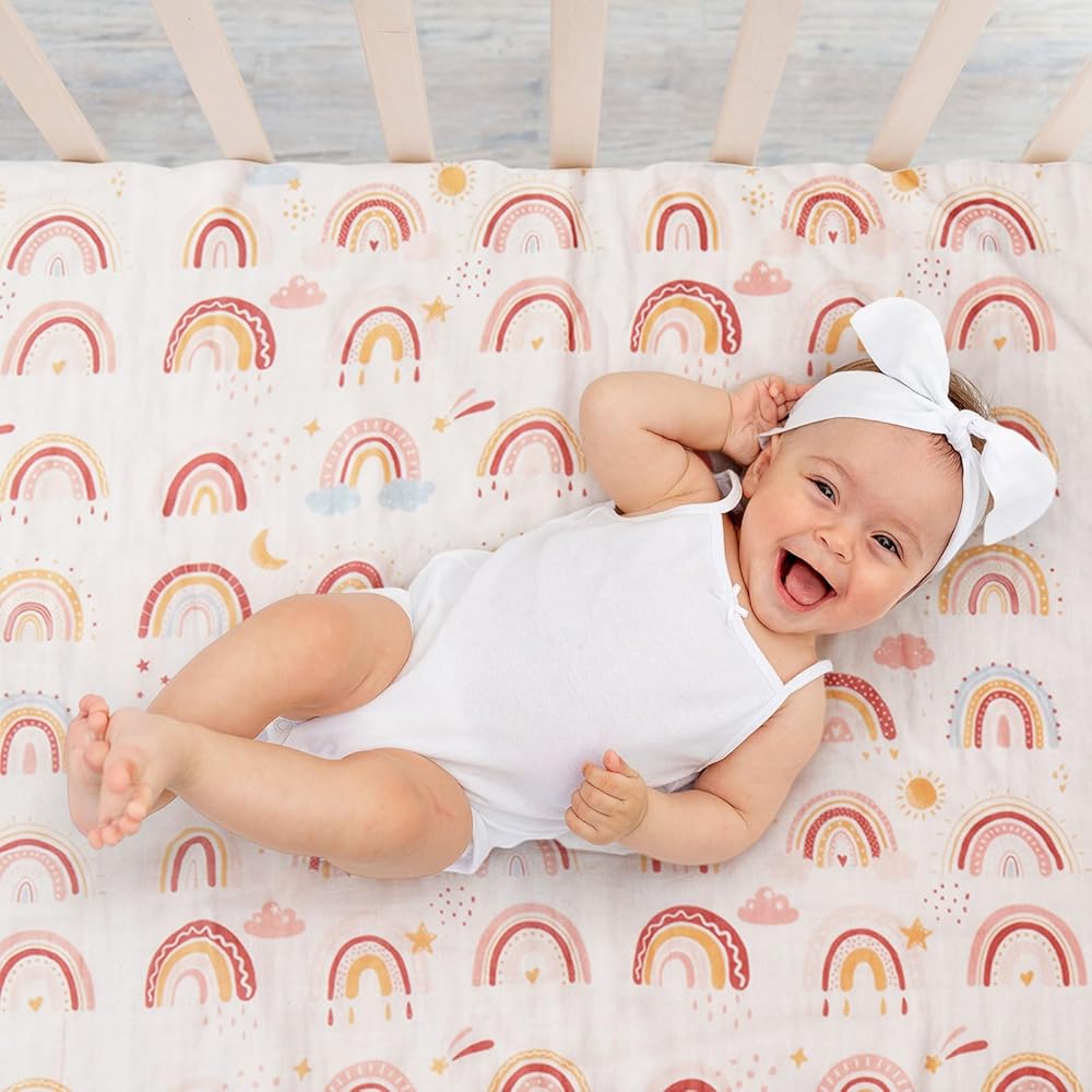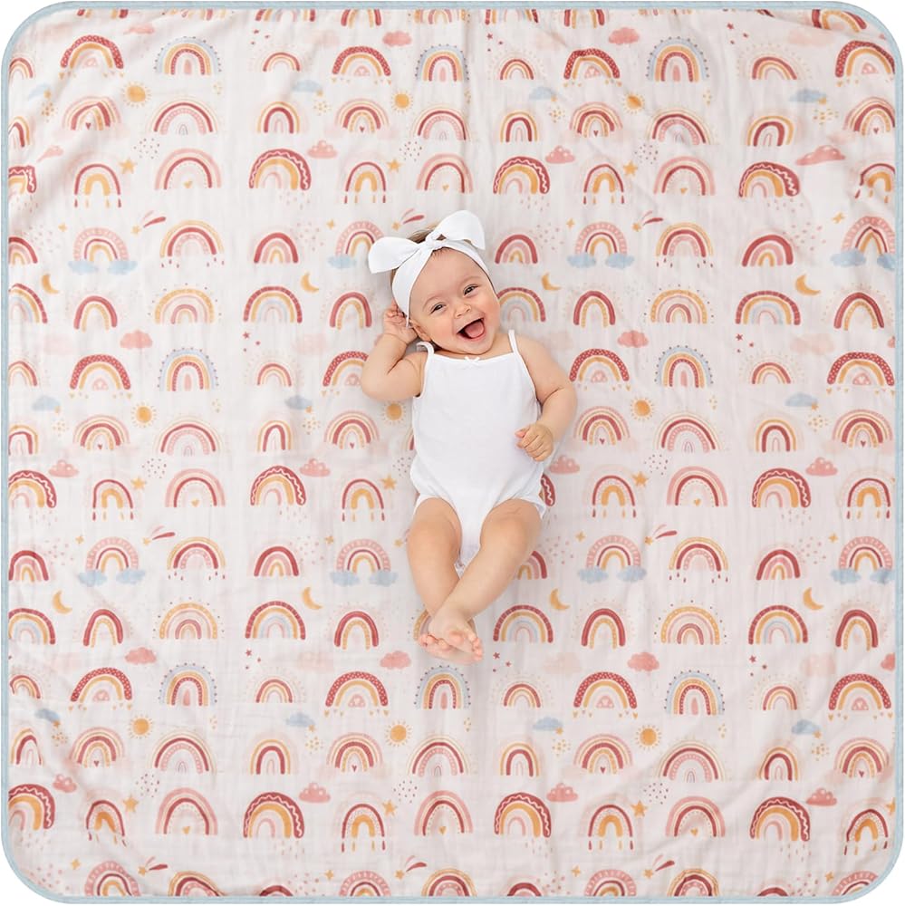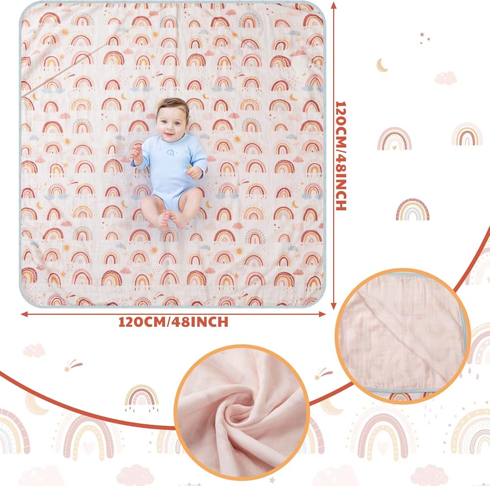 Trusted Comfort: the rainbow muslin quilt baby blanket is made of cotton muslin, which harmonizes comfort, and durability; With double print and 4 layers of fabric, it effectively resists wear and tear while providing the comfortable and cozy feel that your little one desires to feel secure and content
