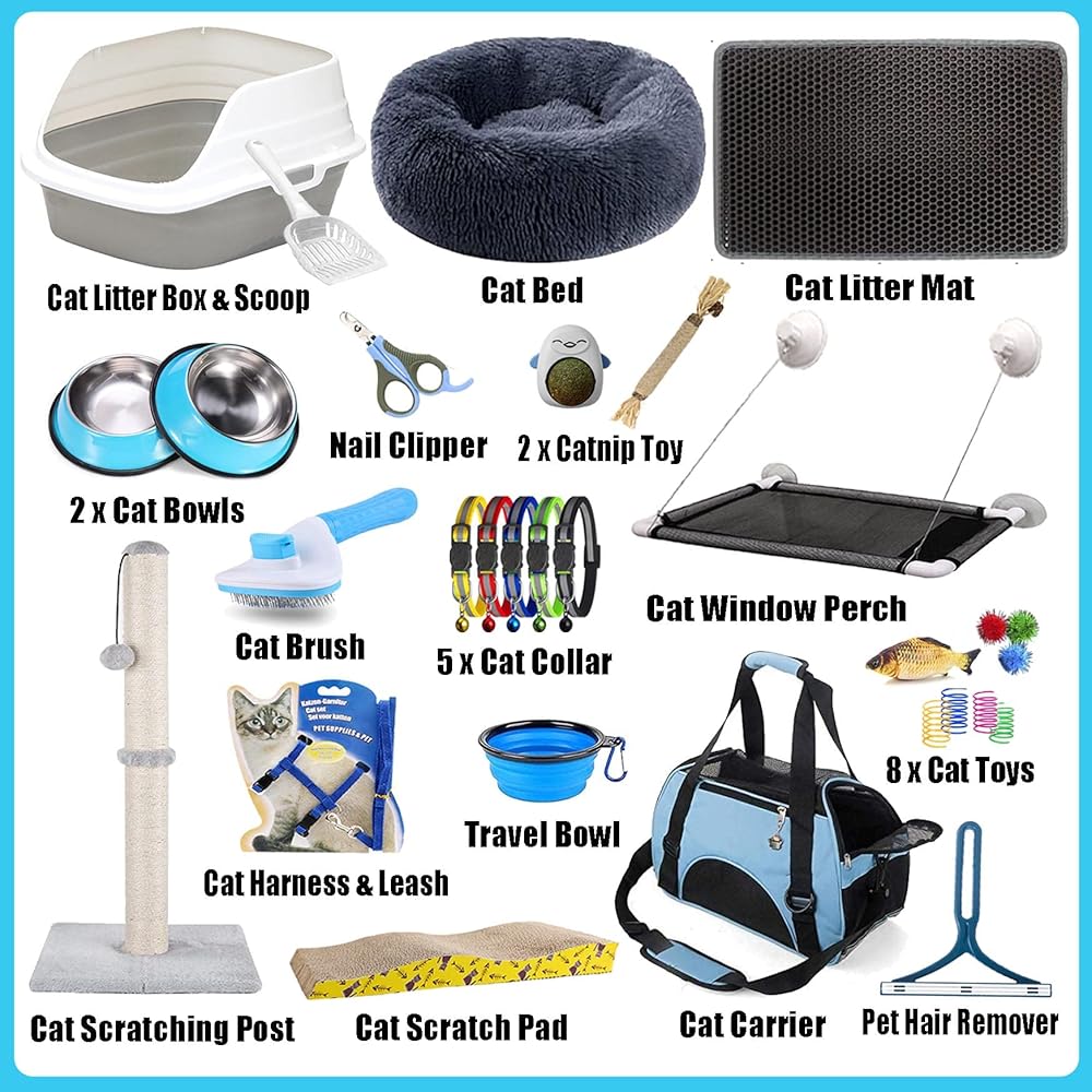 Lobeve Kitten Supplies Starter Kit - مجموعة مكونة من 30 قطعة من مستلزمات القطط الأساسية وأشياء القطط. يشتمل على صندوق فضلات القطط، والألعاب، والسرير، والحامل، والأوعية، والفرشاة، والمزيد. هدية مثالية للترحيب بالمنزل لقطتك الجديدة باللون الأزرق