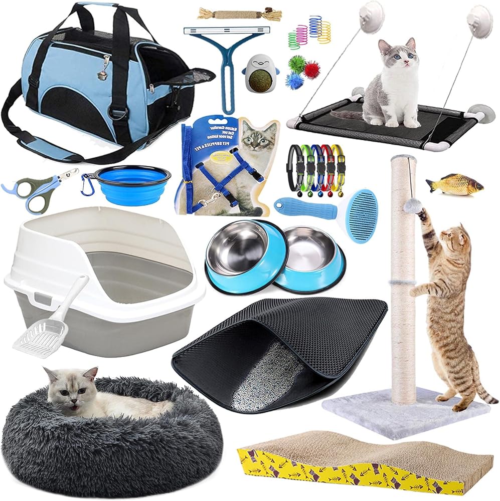 • 😺عبوة قيمة للغاية - مجموعة أساسية يومية 30 في 1 للقطط. تحتوي على: صندوق فضلات القطط، بساط فضلات القطط، سرير للقطط، 2 وعاء فولاذي للقطط، فرشاة للعناية بالحيوانات الأليفة، 10 ألعاب للقطط، فرشاة لإزالة شعر الحيوانات الأليفة، حزام وسلسلة للقطط، مقص أظافر للقطط، حامل للقطط. ، 5 أطواق للقطط، مجثم نافذة للقطط، وعاء سفر للقطط، ووسادة خدش للقطط
