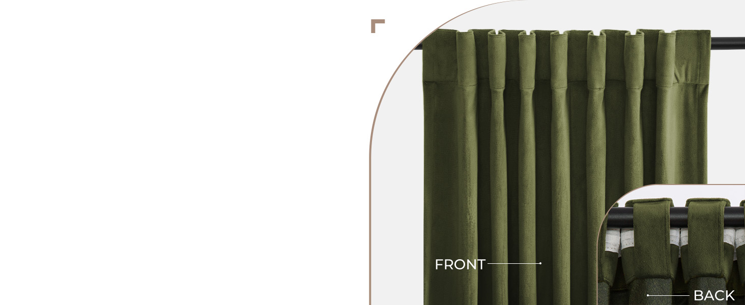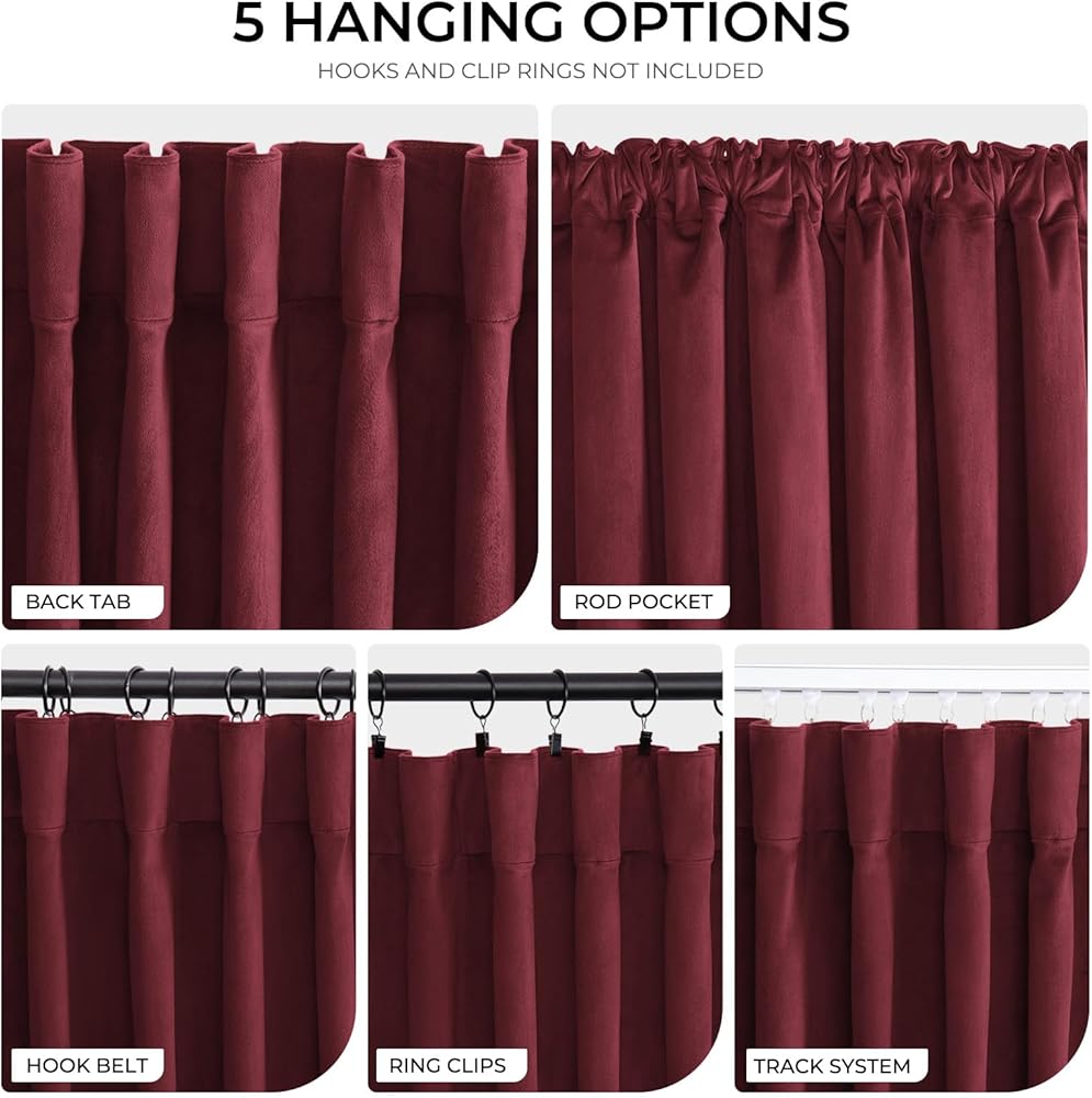 【5 خيارات للتعليق】توفر لك الستائر المخملية المعتمة 5 طرق تعليق مرنة. (1) مع العروات الخلفية تجعل الستائر مثل الطيات الأنيقة. (2) مع جيوب القضبان تجعل الستائر ذات طراز كلاسيكي (3) مع المشابك الحلقية (غير متضمنة) تجعل الستائر تنزلق بسلاسة أكبر. (4) مع حزام خطاف (غير متضمن) للحصول على مظهر ستائري فاخر وجميل. (5) مع نظام المسار للحصول على مظهر جمالي. بالإضافة إلى ذلك، فإن جميع الطرق تناسب القضبان مقاس 3 بوصات وتوفر أقصى تغطية للنوافذ مع توفير المزيد من الحماية للخصوصية.