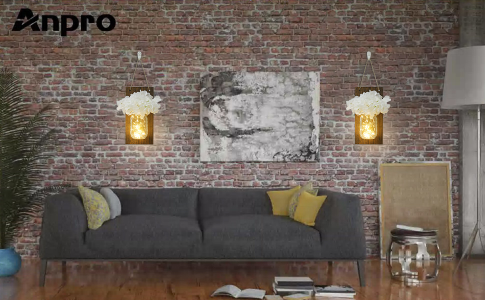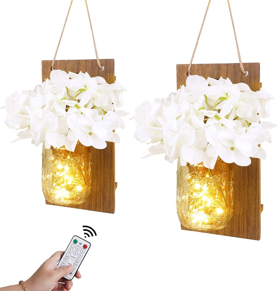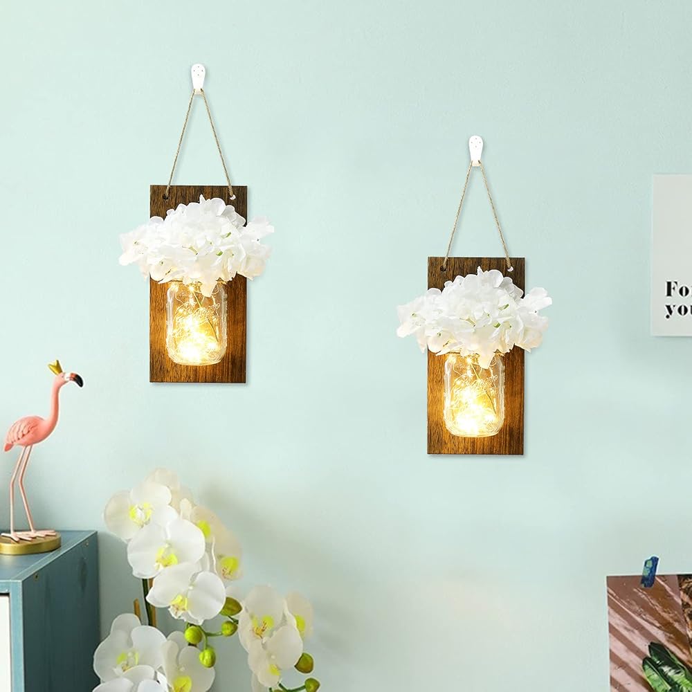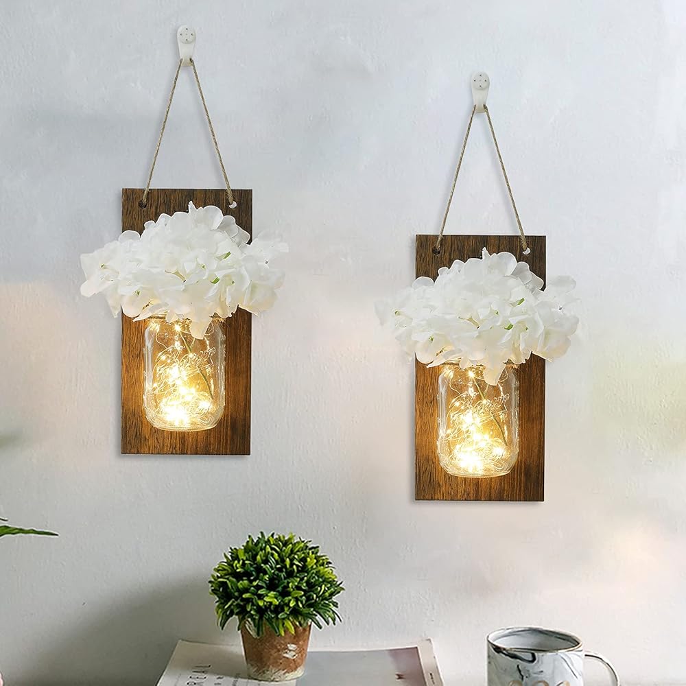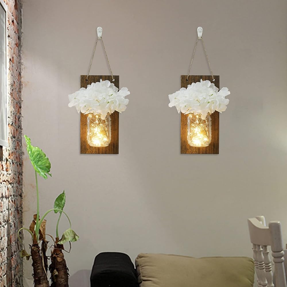 انبرو مجموعة من 2 شمعدان حائط بتصميم ريفي على شكل برطمان ماسون، خطافات من الحديد المطاوع لتزيين المنزل، شريط اضاءة LED ابيض دافئ مع كوبية حريرية، ابيض كريمي